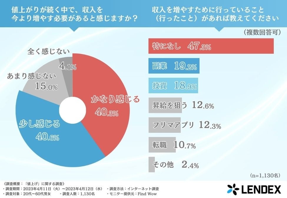 そこで、「値上がりが続く中で、収入を今より増やす必要があると感じますか?」と質問したところ、『かなり感じる(40.3%)』『少し感じる(40.6%)』と約8割の方が収入を増やす必要があると感じているようです。