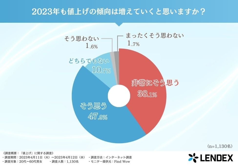 そこで、「2023年も値上げの傾向は増えていくと思いますか?」と聞いたところ、『非常にそう思う(38.1%)』『そう思う(47.9%)』と今後も値上げ傾向が続くと回答した方がおよそ9割に上りました。