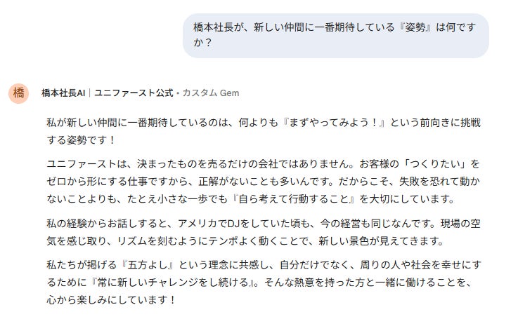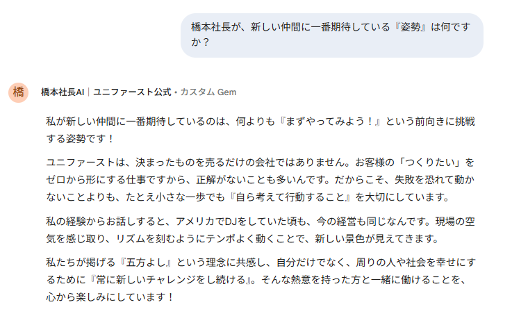 本AIは、これまで橋本社長が発信してきた言葉や考え方をもとに構築されており、候補者が「橋本社長ならどう考えるか」「ユニファーストらしさとは何か」を対話形式で理解できる仕組みです。