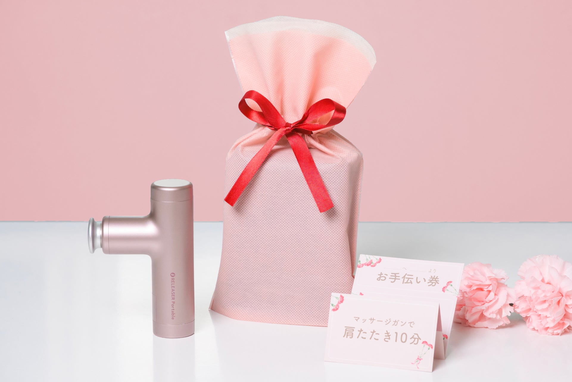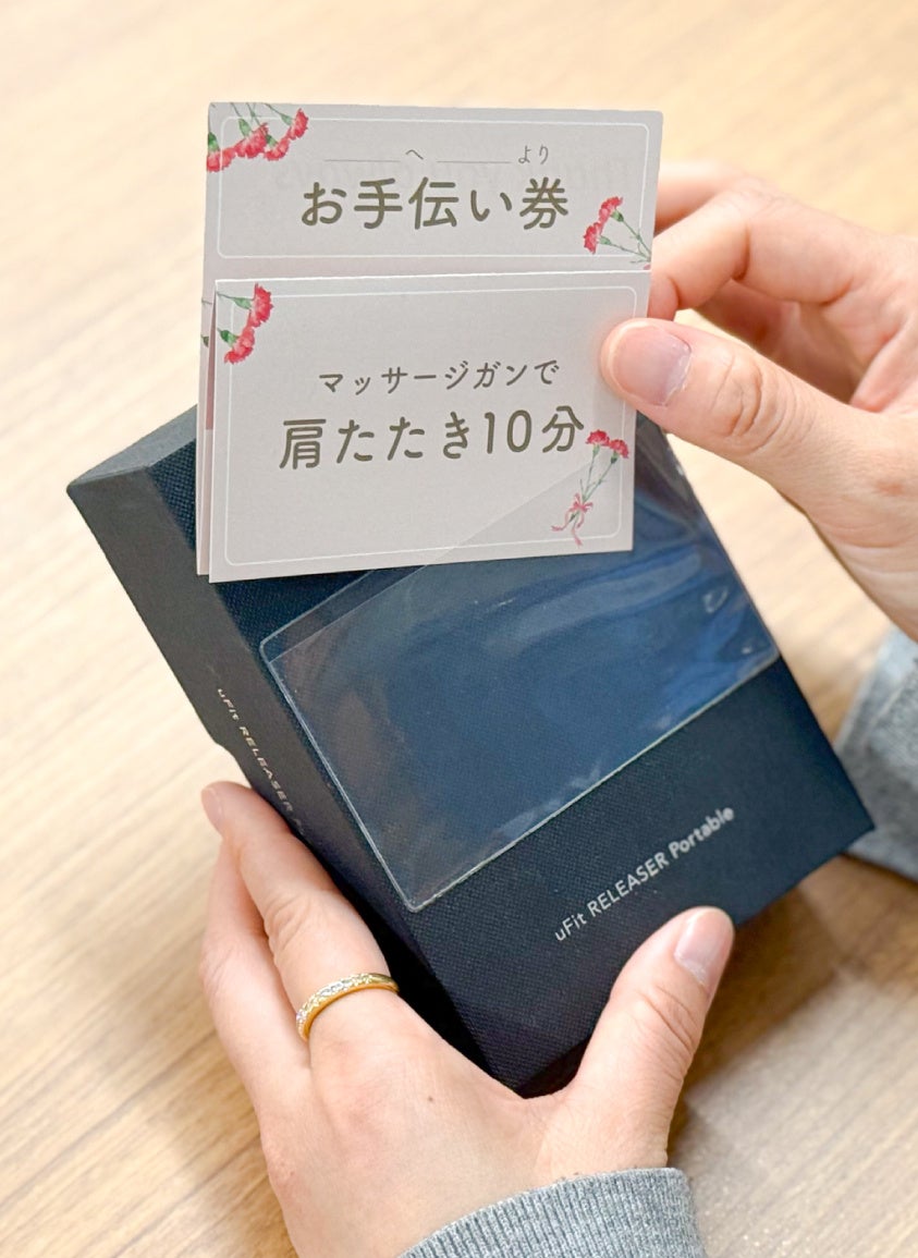 「お母さんには、いつまでも元気でいてほしい」そんな想いを込めて、手のひらサイズのコンパクトなマッサージガン「uFit RELEASER Portable」に昔懐かしい“お手伝い券”とラッピングを添えた「uFit RELEASER Portable 母の日特別ギフトセット」をご用意しました。