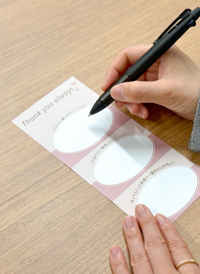 学生時代に家事や送り迎えをしてくれたお母さんに、いつも家庭を一緒に支えてくれている奥様に、子どもとパパからママに。