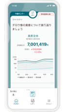 ユーザーの保有資産を管理し、資産形成に気づきを与えるアプリです。具体的には「さまざまな金融機関などで保有する資産のデータと連携することで、現在の資産全体を可視化する一元管理機能」「金融資産が枯渇してしまう可能性のある年齢を示す資産寿命算出機能」「資産配分の状況や月々の貯蓄額等について、現状とアプリが推奨する状態を比較できる診断機能」と、大きく3つの機能を備えています。株式会社マネーフォワード(代表取締役社長CEO:辻庸介)と共同で制作し、2021年度にはグッドデザイン賞(主催:公益財団法人日本デザイン振興会)を受賞しました。これまで当社が培ってきた対面営業でのノウハウをコンテンツとして提供し、資産形成や管理に関する新しい価値をお届けします。
