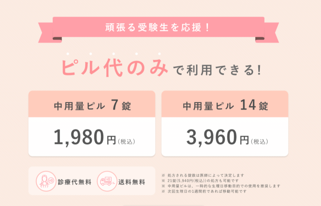 内容:メデリピルで生理日移動が可能な「中用量ピル」を処方する際に、産婦人科医によるオンライン診療代・送料を無料でご提供します。