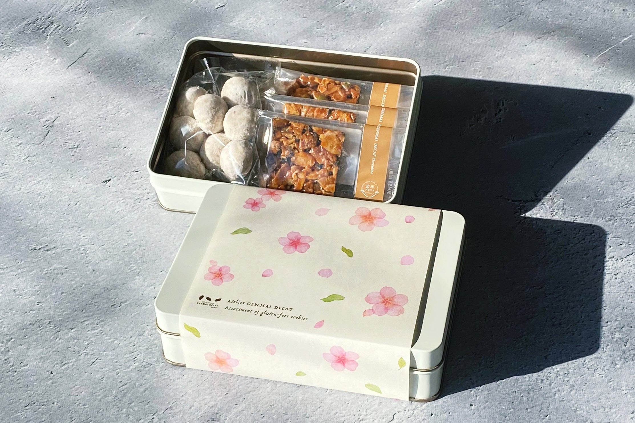 今回は、今の季節にぴったりの桜モチーフのクッキー缶と、より手軽に玄米デカフェを楽しめるティーバッグタイプ(1袋10包入り)をご用意しました。