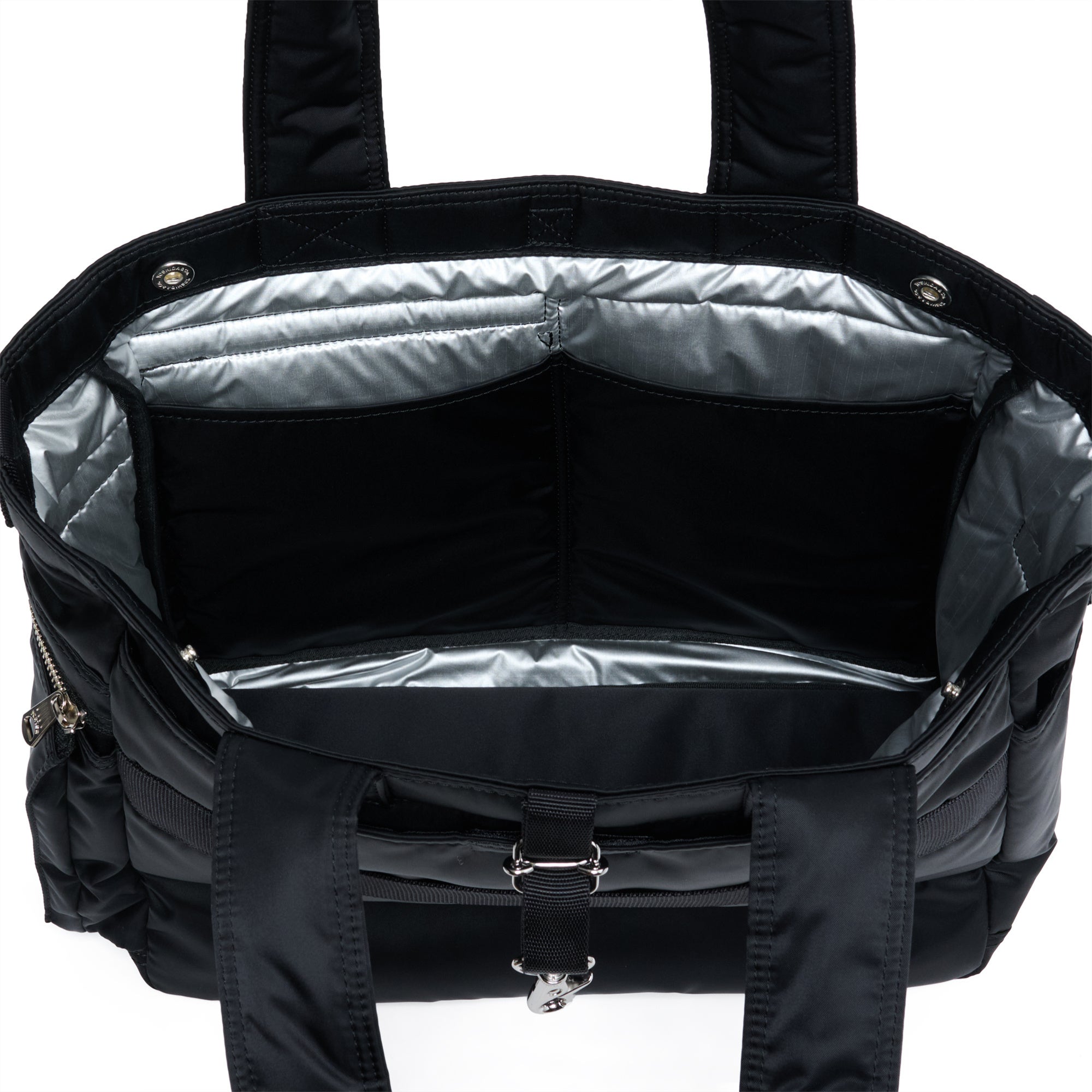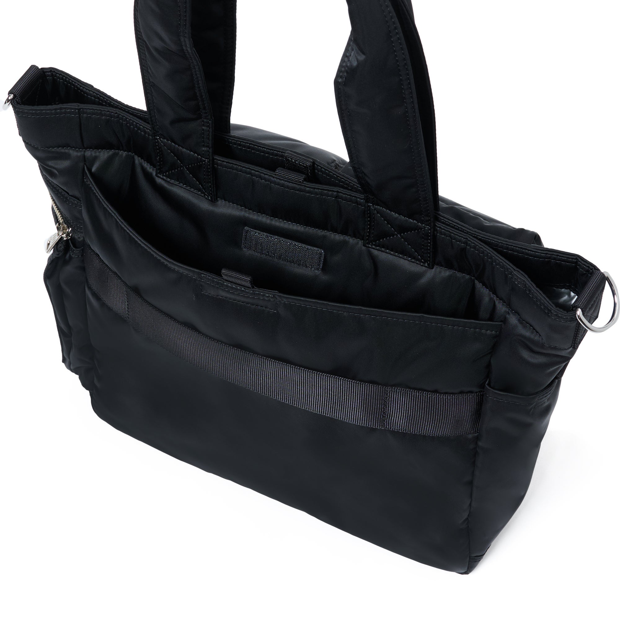 開口部にはホックの他にナスカンで止めることができるベルトを取り付けており、荷物をたくさん入れても開口部を閉じることができる仕様です。様々なサイズの書籍を収納できる外装ポケットの他、内装にも3つのポケットを配し、荷物を整理・収納することができます。