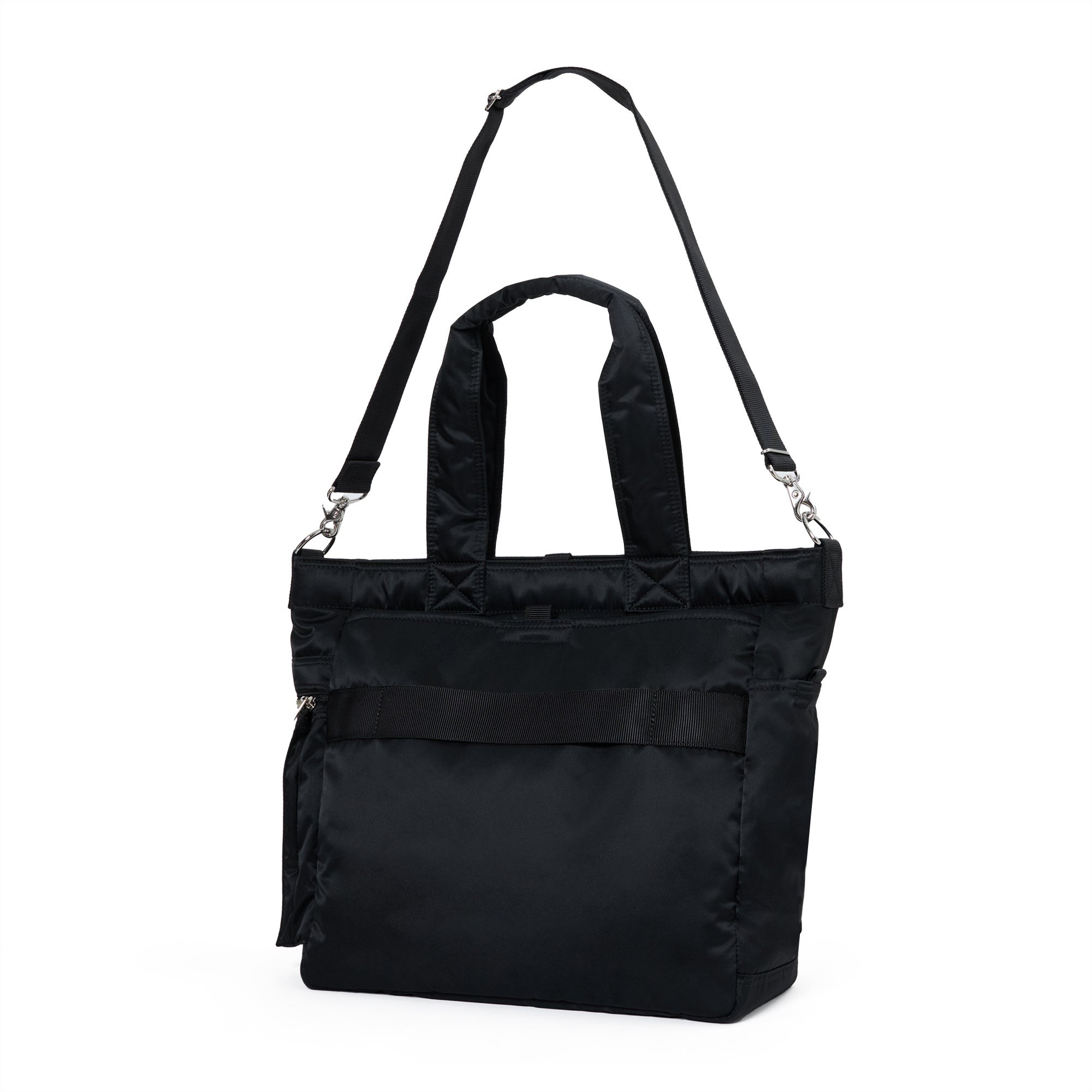 ハンドルは長めに設計し、肩にかけて使用できます。また、取り外しできるショルダーストラップが付属し、斜め掛けで使用することも可能です。
