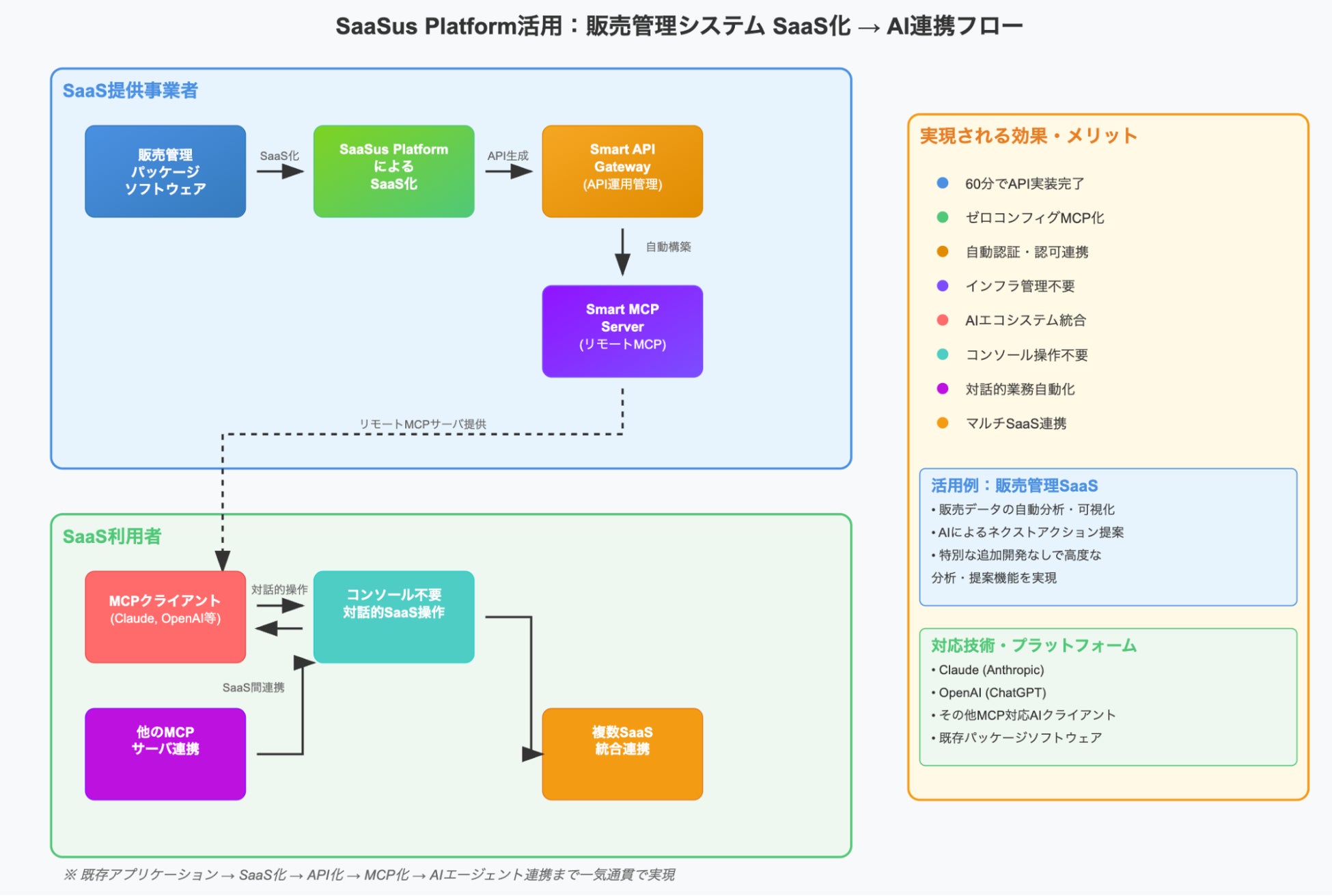 そしてこの度、生成されたAPIをClaudeやOpenAIなどのリモートMCP対応クライアントからそのまま呼び出せる新機能「Smart MCP Server」の提供を開始しました。これにより、『SaaSus Platform』ユーザーは、既存アプリケーション(クライアントサーバなど)=> SaaS化 => API化 => MCP化という一連の流れを一気に短期間で実現することができます。