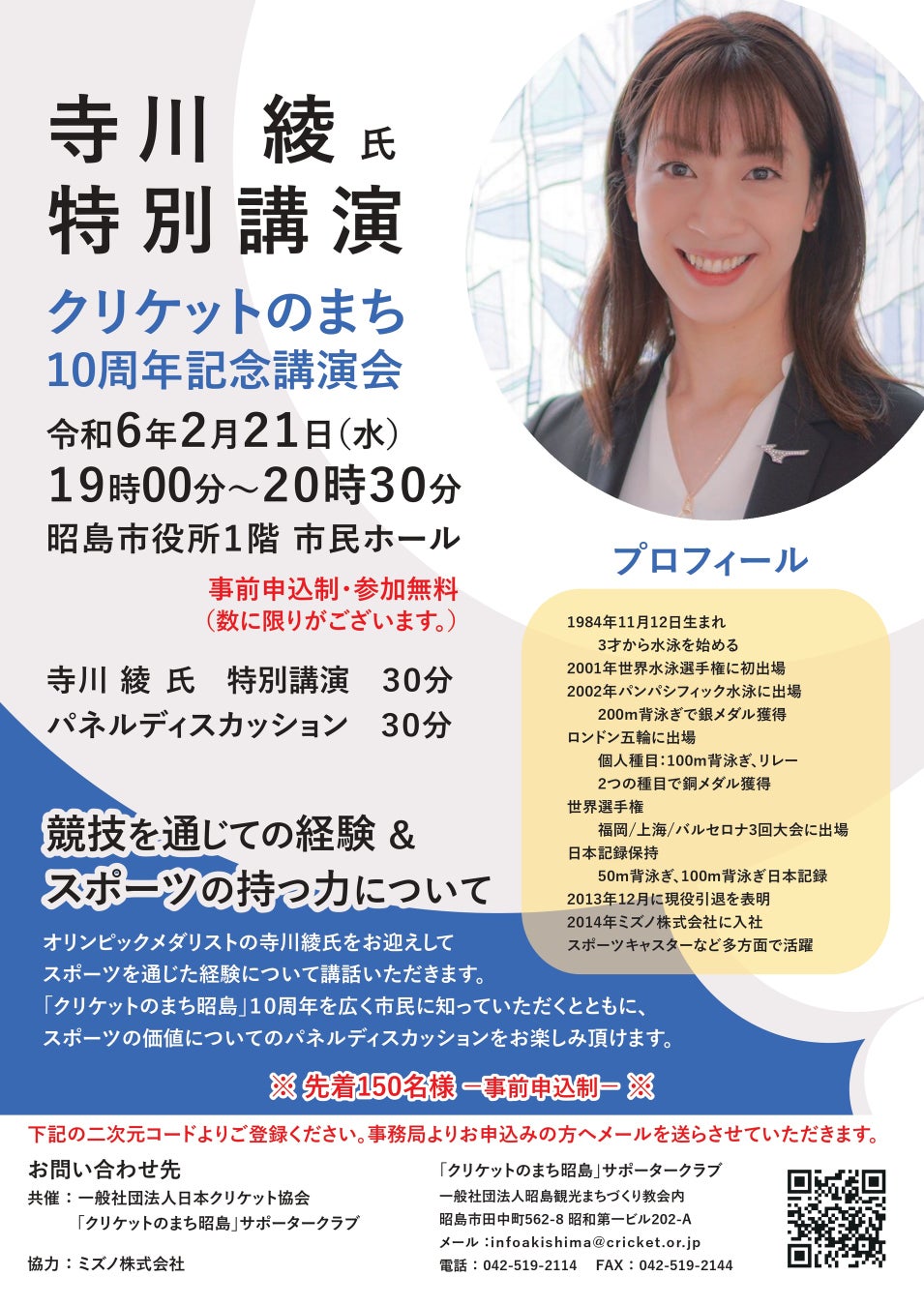 昭島市でクリケットのまちづくりが10周年を迎え、2028年ロサンゼルスオリンピックへのクリケットの追加が決定しました。これを祝して、「サポータークラブ」がオリンピックメダリスト寺川綾氏をお招きして特別な講演会とパネルディスカッションを開催いたします。このイベントでは、「クリケットのまち昭島」の10周年を祝し、さらなるまちづくりへの期待やプロジェクトの進捗を発表いたします。また、寺川綾氏による講演では、彼女の前線でのスポーツ経験から得られた知見や学びが、クリケットのまち昭島の未来をさらに豊かにする参考になることでしょう。
