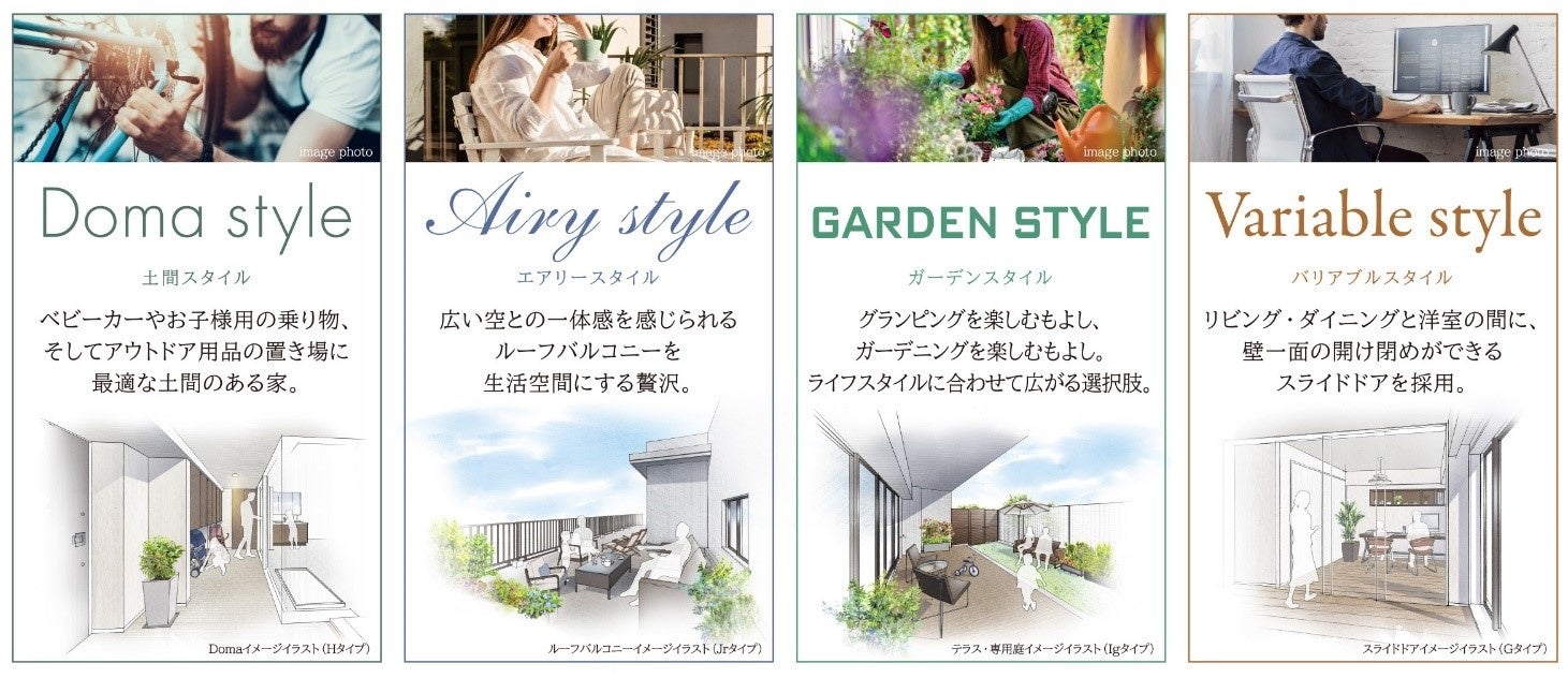 玄関土間プラン、ルーフバルコニープラン、専用庭付プランなど様々なスタイルを提案