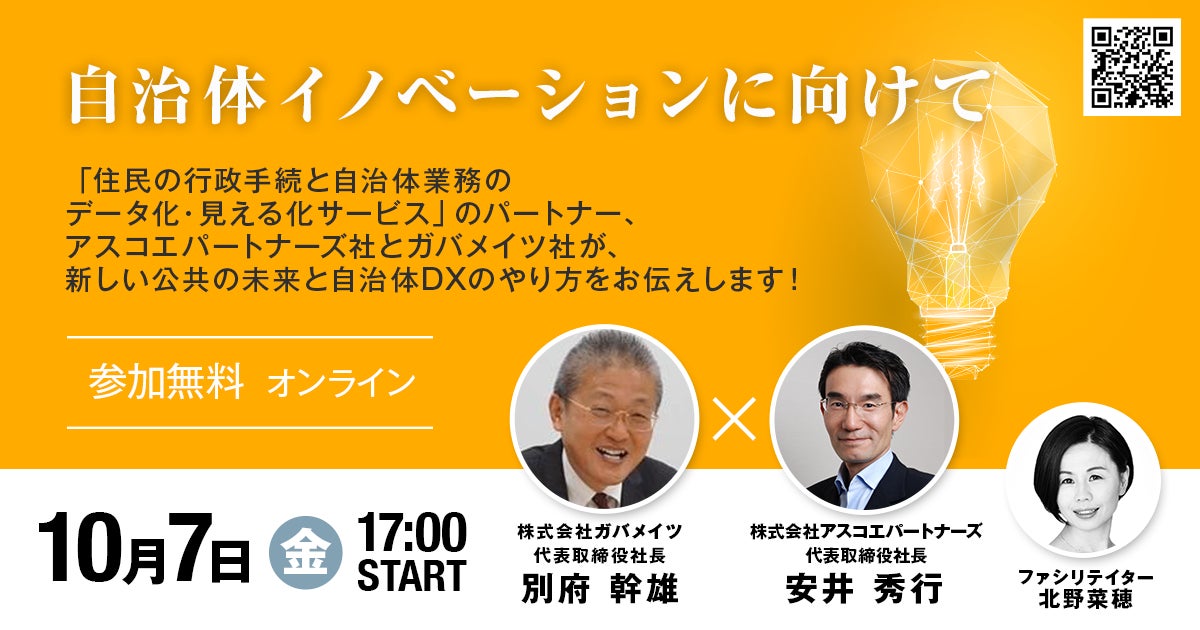 株式会社アスコエパートナーズ(所在地:東京都港区 代表取締役社長:安井 秀行)と株式会社ガバメイツ(所在地:愛媛県松山市 代表取締役社長 別府 幹雄)は、10月7日(金)にウェビナー「自治体イノベーションを加速する!住民利便性と自治体業務を全て簡単に見える化する方法」を開催します。