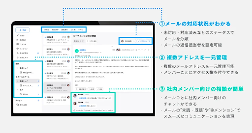 「複数メールの対応状況をチームで一元管理」「Slack・Chatwork連携」などで社内外のコミュニケーションを効率化し、迅速な顧客対応を実現することができます。