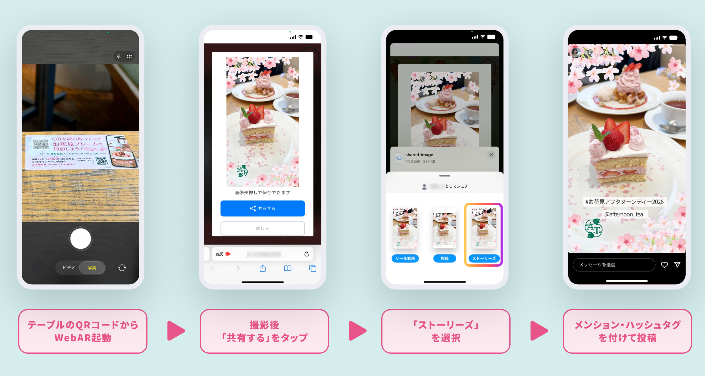 2026年3月5日~4月22日の期間中、店内のテーブルに設置されたQRコードをスマートフォンで読み取ると、満開の桜をイメージした「お花見フォトフレーム」が出現。フォトフレームを使用して店内メニューを撮影し、InstagramまたはXへ投稿すると、ティールームで利用できる「Afternoon Tea TEAROOM e Gift」が当たる抽選に参加できるSNSキャンペーンを実施しました。