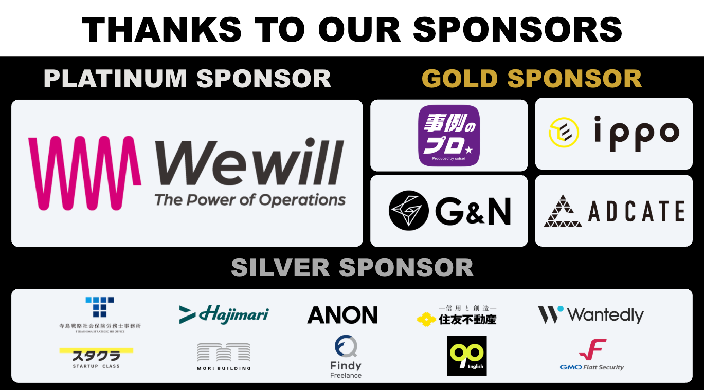 協賛(順不同・社名略記): Wewill、G&N、IPPO、アドケイト、スイセイ、寺島戦略社会保険労務士事務所、Hajimari、ウォンテッドリー、住友不動産、90、スタクラ、森ビル、ファインディ、ANON、GMO Flatt Security、ぴんぴんきらり