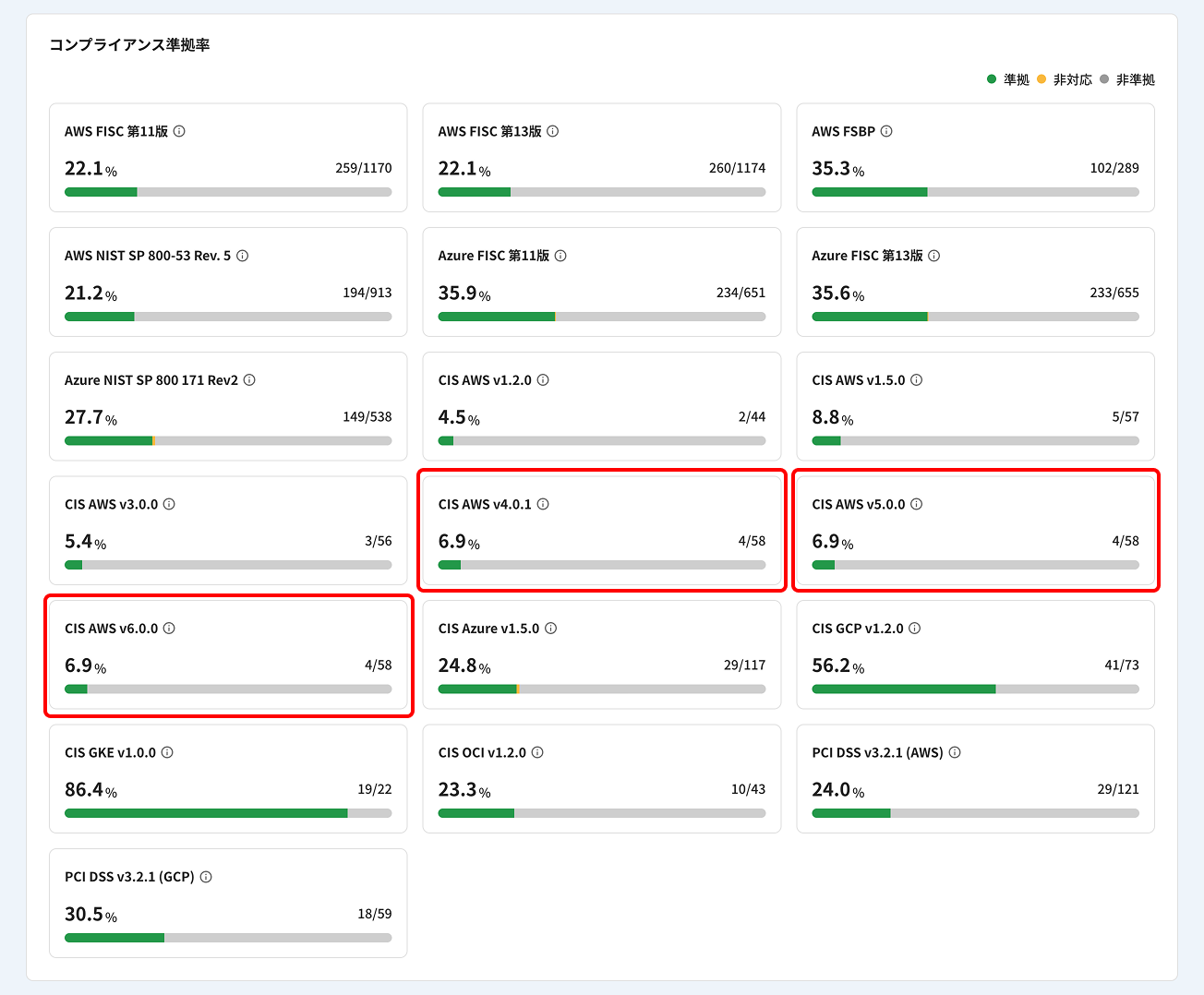他のコンプライアンスと同様に、ダッシュボード画面およびコンプライアンス画面にて、各コンプライアンスへの準拠状況を確認できます。