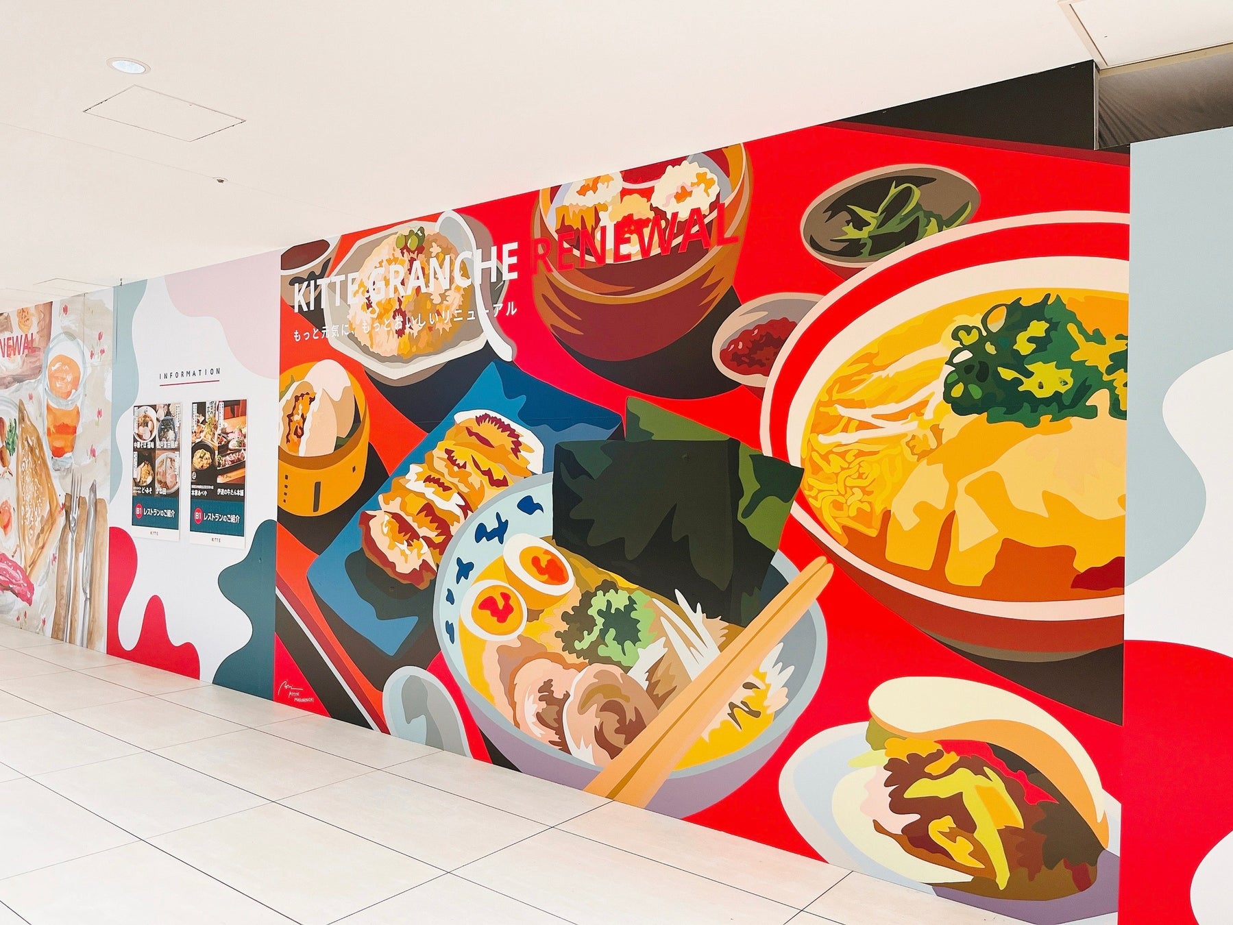 アートが広がるのは、B1Fフロア「ラーメン激戦区」前。食事を楽しむ多くの方々が訪れるこの場所に、『もっとおいしいリニューアル』をテーマに、TOSHIYUKI HIRANOとIORI KIKUCHIのテイストの異なる二人のアーティストが参加しました。