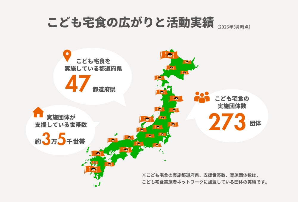 こども宅食応援団は2026年秋に、設立8周年を迎えます。これまで多くの寄付者の皆さまに支えられながら、全国の団体とともに活動を広げ、現在では47都道府県でこども宅食の取り組みが実施されるまでに広がっています。