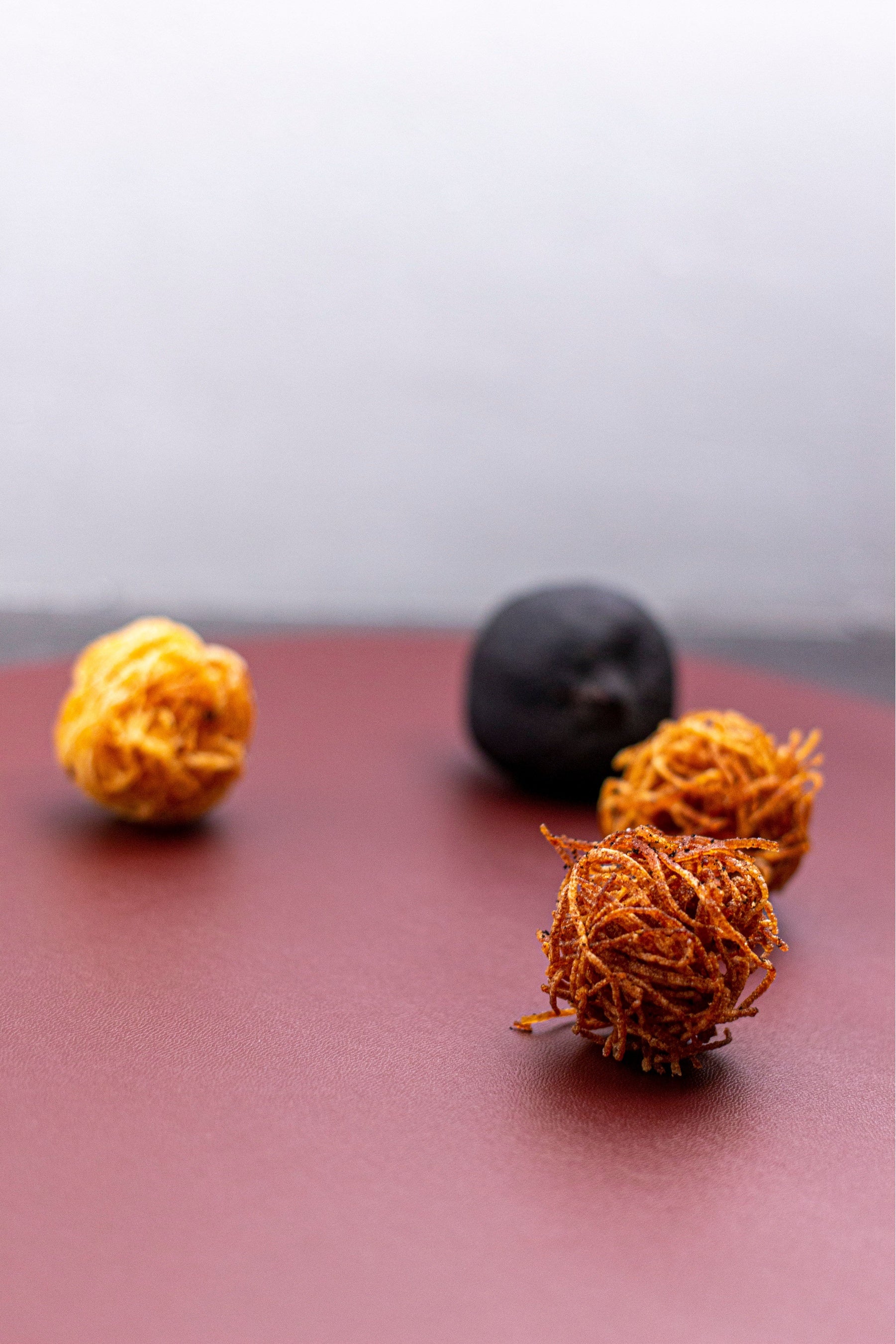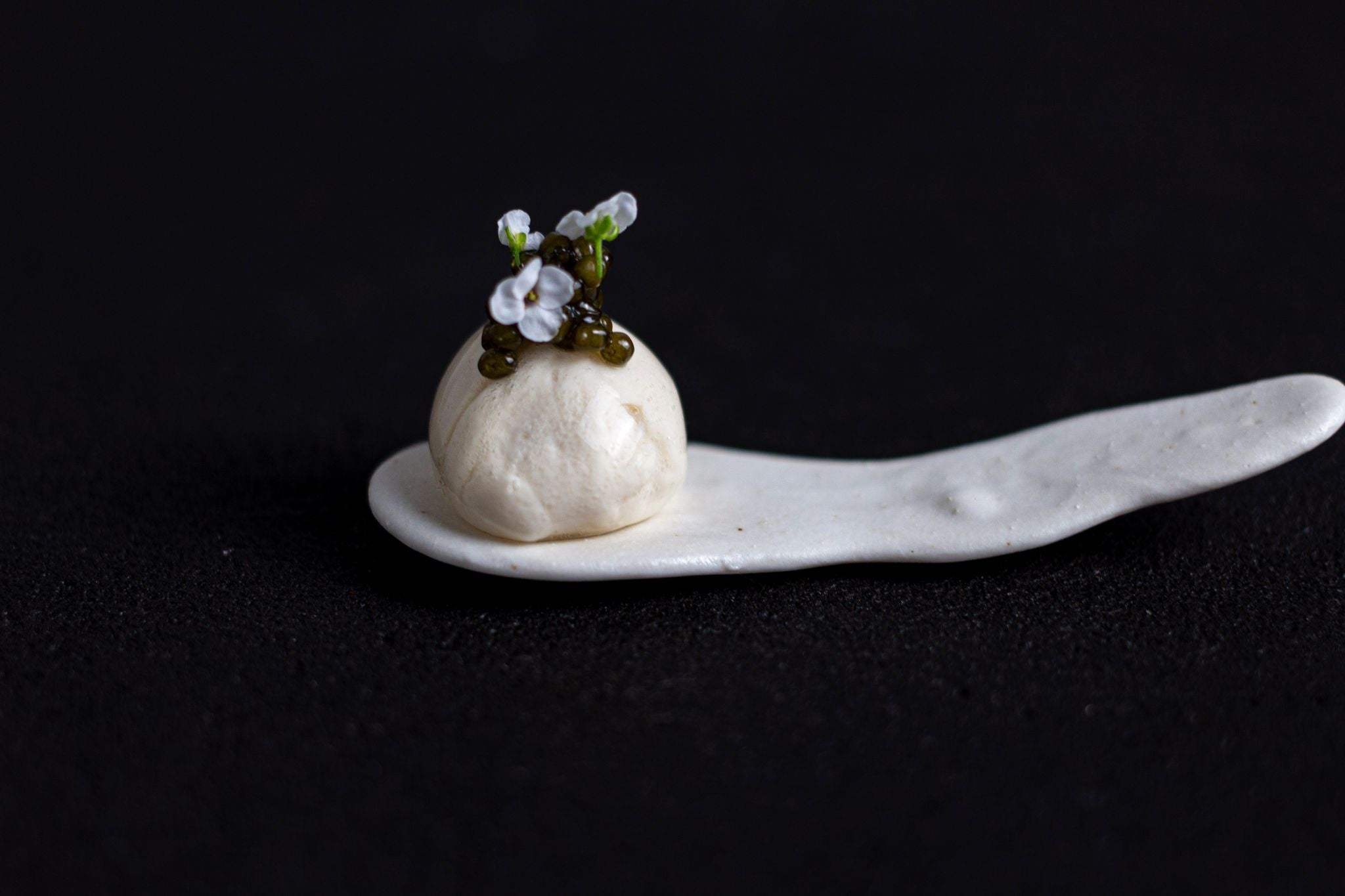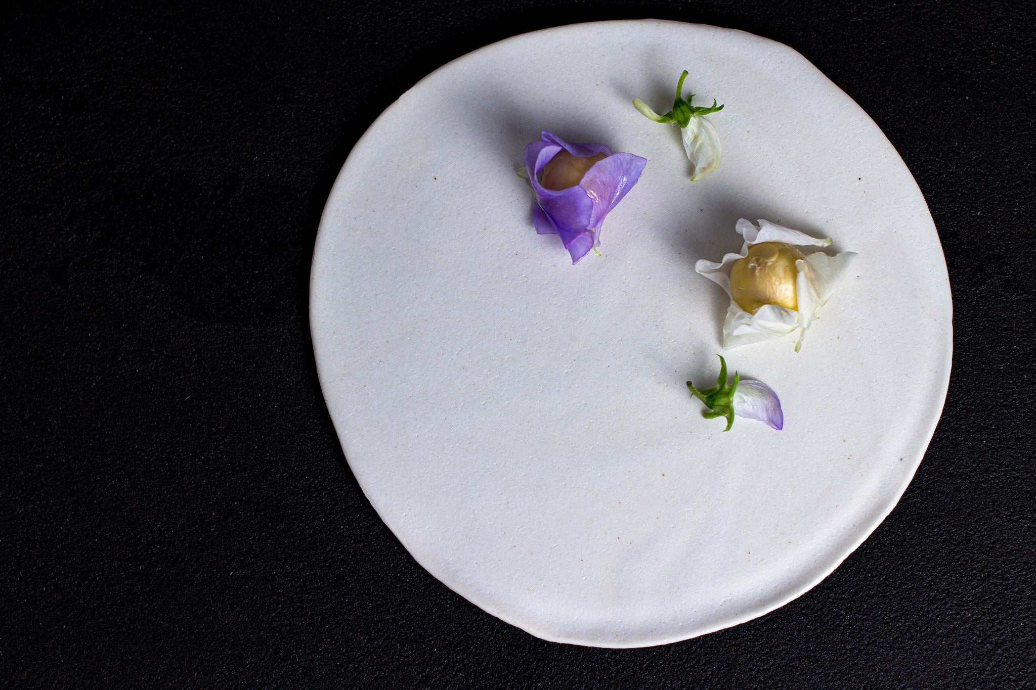 左から:グリーンアスパラ・鯛白子、ジャガイモ・炭化檸檬、スイートピー・フランボワーズ