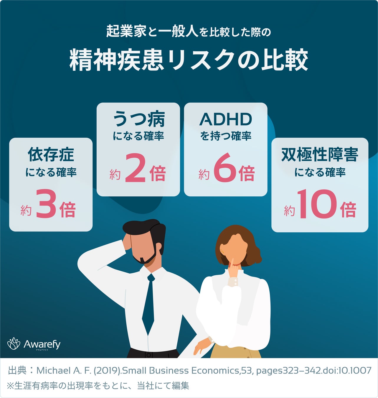起業家のメンタルヘルス研究第一人者であるMichael Freeman博士によると、スタートアップの起業家・経営者は一般の人と比べて、様々な精神疾患を抱えるリスクが非常に高いことが明らかになっています。