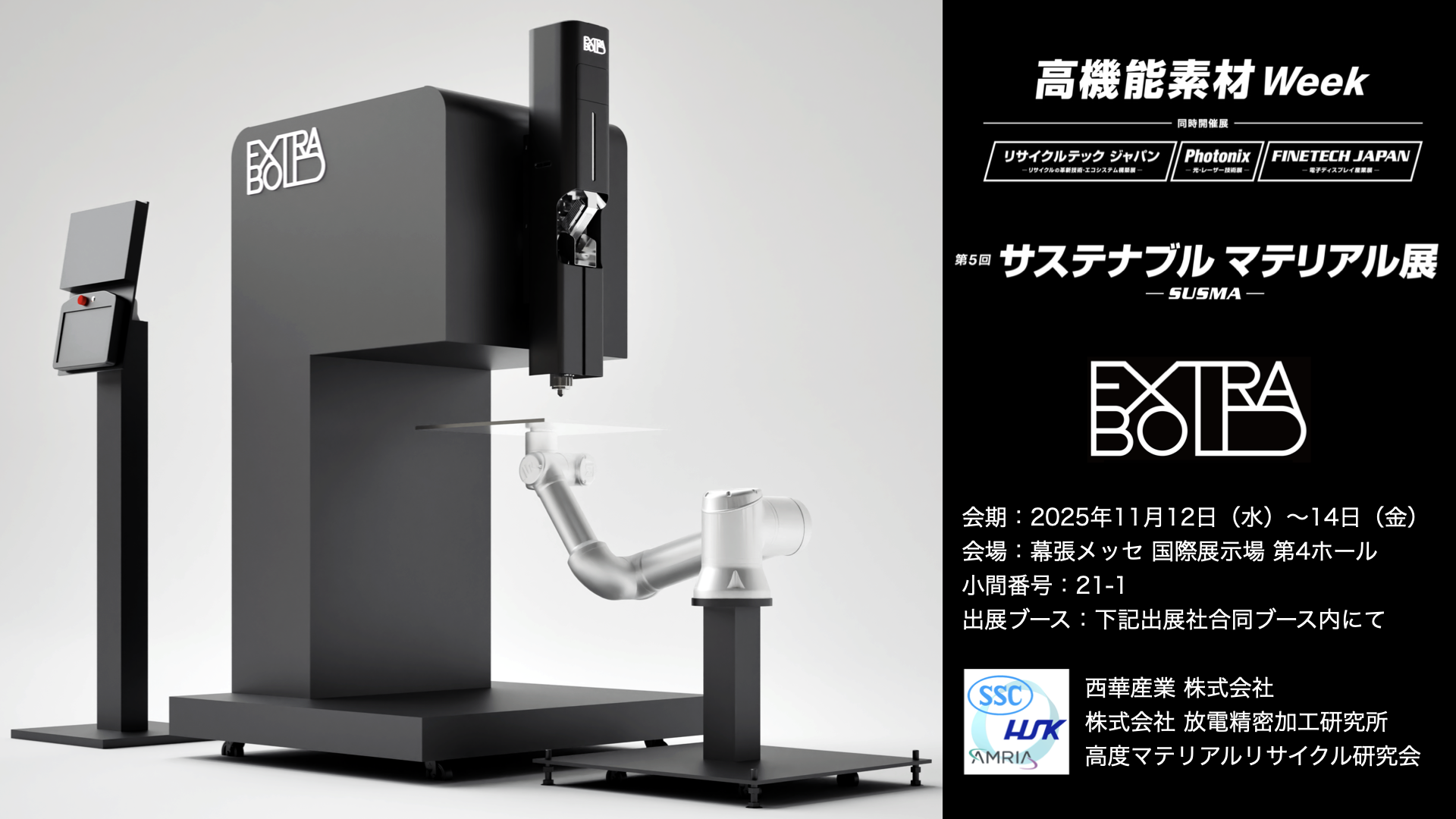 株式会社ExtraBold(本社:東京都豊島区、代表取締役CEO:原雄司)は、2025年11月12日(水)~14日(金)に幕張メッセ国際展示場で開催される「高機能素材Week/サステナブル マテリアル展2025」において、西華産業株式会社、株式会社放電精密加工研究所、および高度マテリアルリサイクル研究会のメンバーとして共同出展いたします。本展示では、ExtraBoldが開発した協働ロボット型樹脂ペレット式3Dプリンター「REX-BUTLER」の実機を展示します。