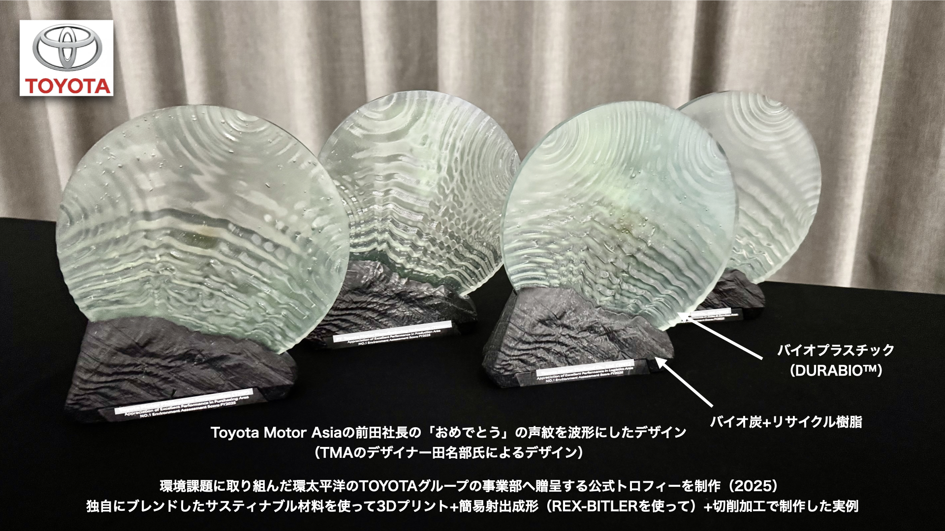 今回は、TOYOTA MOTOR AISA様向けに再生樹脂やバイオ炭を独自にブレンドした材料と植物由来の樹脂(DURABIO™)材料で、REX-BUTLERを用いてAM(3Dプリント)+切削加工+簡易成形で制作したトロフィーやその他弊社で制作したスツールなどを展示します。