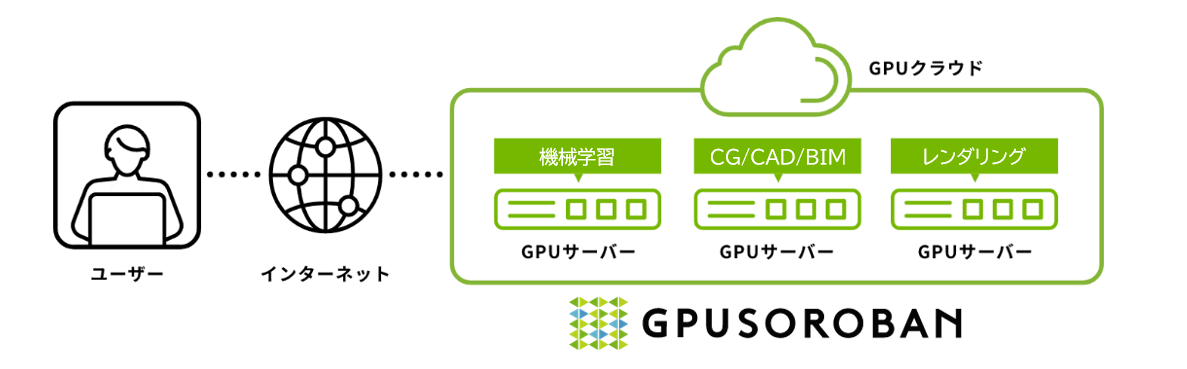 「GPUSOROBAN」は、AI・機械学習・シミュレーション等の膨大な計算処理を高速化するGPUクラウドサービスです。データセンターの建設コストや運転コストを抑えることで、NVIDIA A100(*)をはじめとする高性能GPUサーバーを低コストで提供しています。予算計画が立てやすい月額定額プランも用意しており、国内企業や学術研究機関が使いやすいサービス設計となっております。