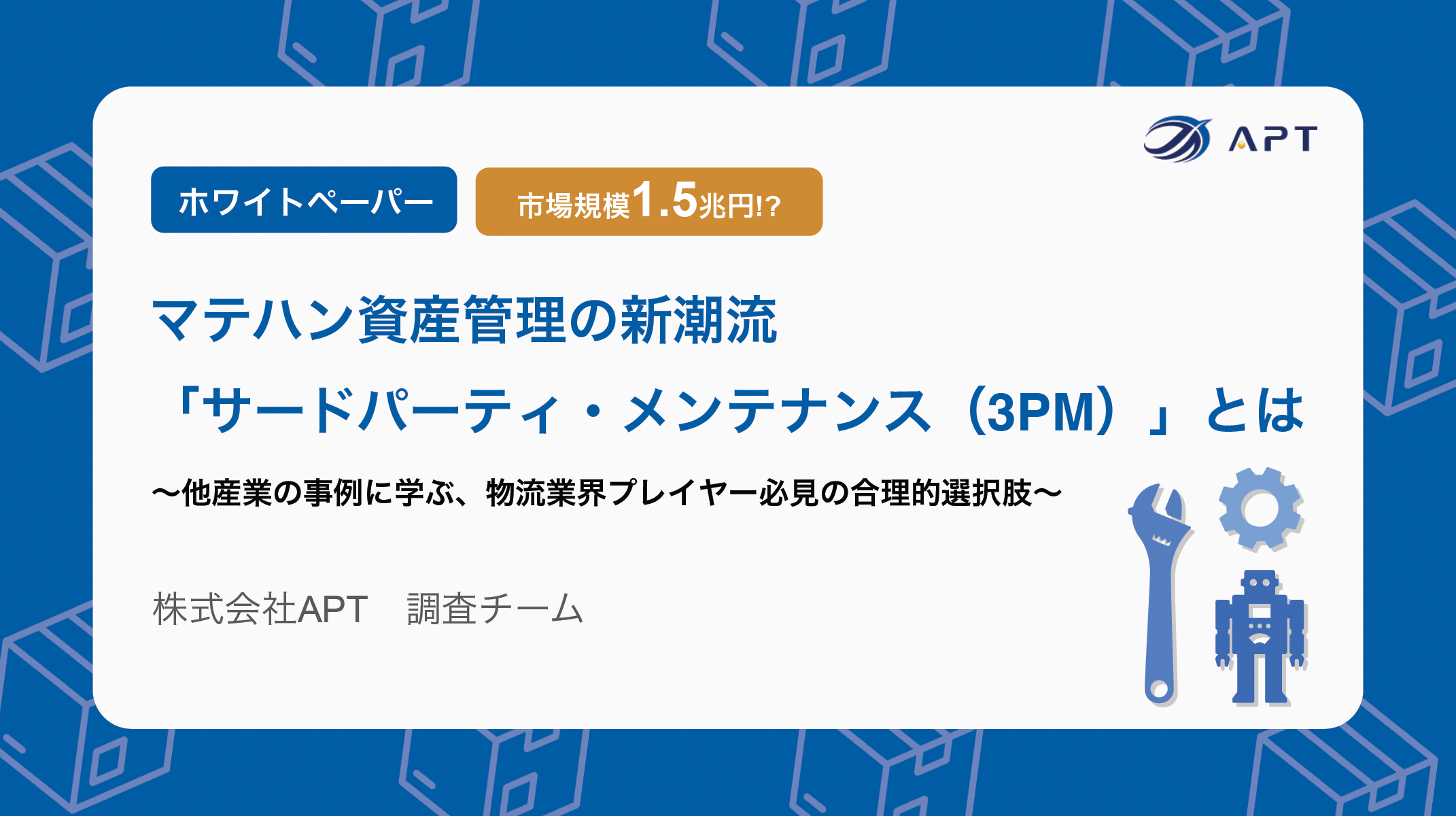 株式会社APT(本社:千葉県千葉市、代表取締役:井上 良太、以下「APT」)は、物流・マテハン業界における新たな保守運用モデルについてまとめた調査レポート(ホワイトペーパー)「サードパーティ・メンテナンス(3PM)とは 〜他産業の事例に学ぶ、物流業界プレイヤー必見の合理的選択肢〜」を無料で公開いたしました 。