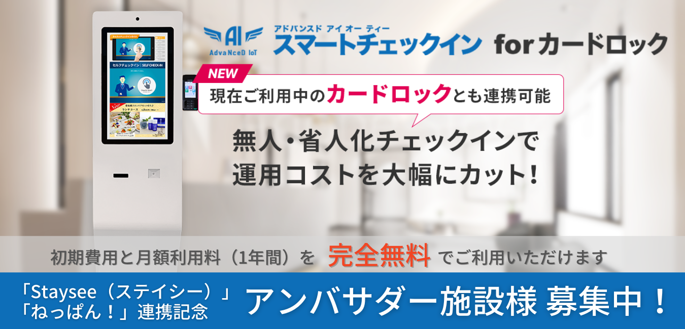 「Staysee」または「ねっぱん!」ご利用の宿泊施設様必見!AdvaNceD IoTスマートチェックイン for カードロックの初期費用&月額利用料(1年間)を無料で利用できるアンバサダー施設を募集