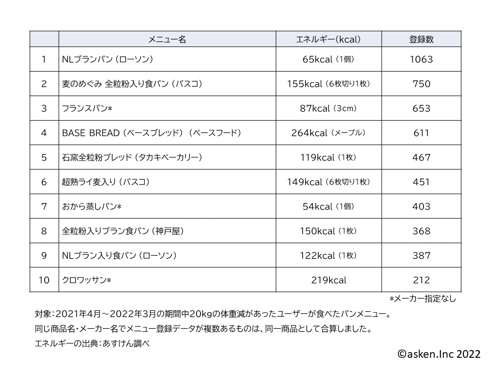 4月12日の『パンの記念日』に合わせ、年間20kgの大幅な減量に成功したユーザー(202名)が食べていたパンの種類を集計。「全粒穀物」といわれる穀類を使ったパンの登録数が上位に並び、太りにくいパンを上手に食べていることが特徴的でした。