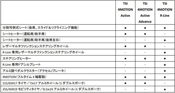 「TSI 4MOTION」モデルのグレード構成は3グレードで、全国希望小売価格は、¥4,792,000(税込)~¥5,816,000(同)です。