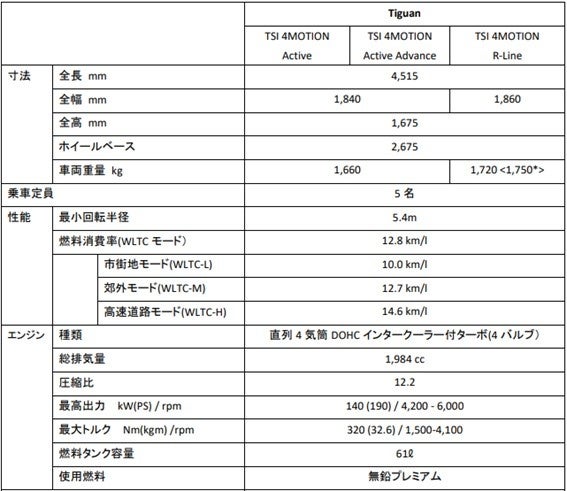 新型「Tiguan TSI 4MOTION」諸元表 <>:オプションパッケージ装着車