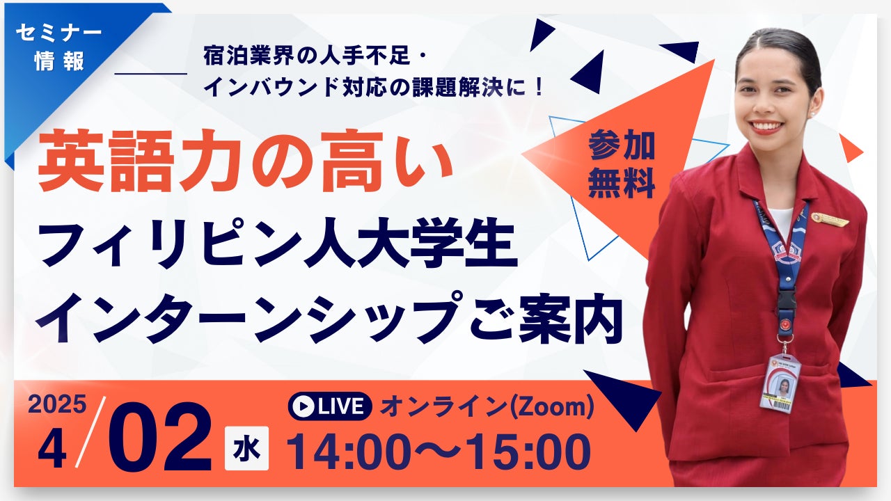 ≪4/2開催≫ 宿泊業界向け・フィリピン人大学生インターンシッププログラム オンラインセミナー開催のお知らせ