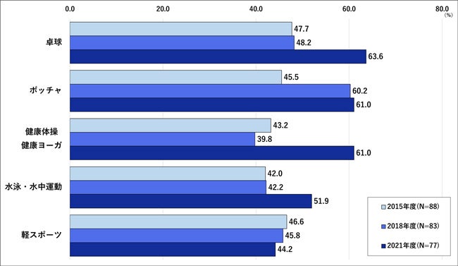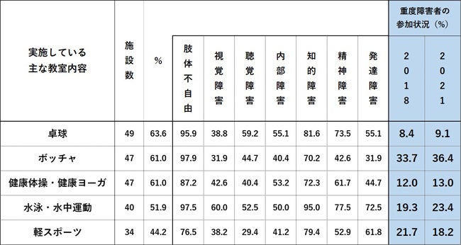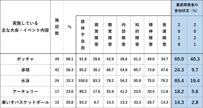 重度障害者の参加状況は、「ボッチャ」が40.3%で最も多く、ついで「水泳」(19.4%)、「卓球」(9.7%)だったが、2018年度調査と比べると全種目で減少した。大会・イベントは参加者全員の把握が難しく、会場の感染症対策の確認が難しい施設もあり、重篤化リスクの高い重度障害者が参加を敬遠したと考えられる。