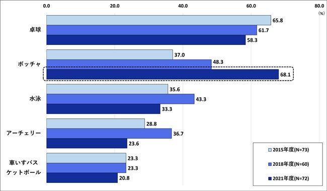 障害者専用・優先スポーツ施設における種目別スポーツ大会やイベントでは、「ボッチャ」が68.1%と最も多く、ついで、「卓球」(58.3%)、「水泳」(33.3%)だった。2018年度調査と比較すると、東京2020パラリンピックで注目を集めた「ボッチャ」を実施する施設が大きく増加した。