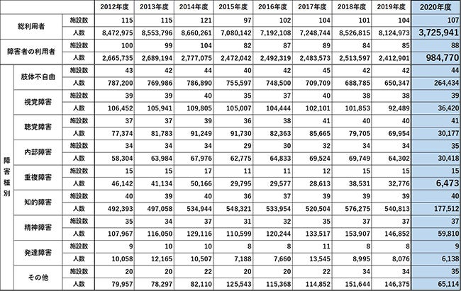 2012年度から2019年度までの、障害者専用・優先スポーツ施設の利用状況をみると、総利用者数は700~800万人、障害者の利用者数は250万人前後で推移。新型コロナウイルスの影響を受けた2020年度は、総利用者数が370万人、障害者の利用者数は98万人と、いずれも半減している。