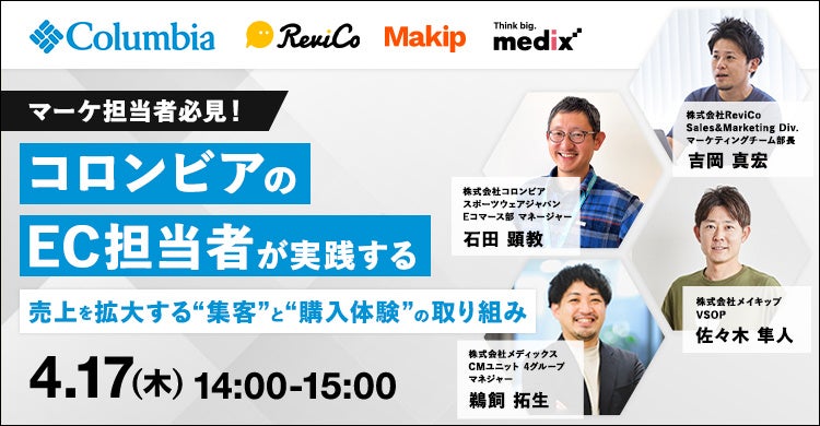 インターネット黎明期から企業のデジタルマーケティングを支援している株式会社メディックス(本社:東京都千代田区、代表取締役社長:田中 正則、以下:メディックス)は、アパレル業界ECのマーケティング担当者様、事業責任者様向けに、オンラインセミナー「コロンビアのEC担当者が実践する 売上を拡大する"集客"と"購入体験"の取り組み」を開催いたします。