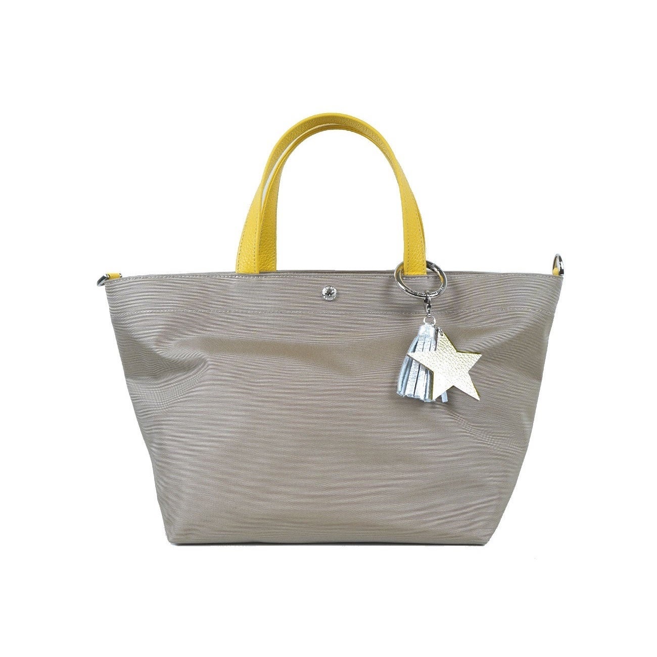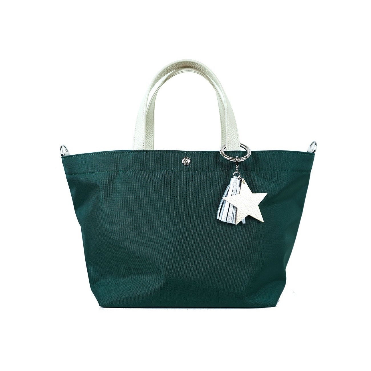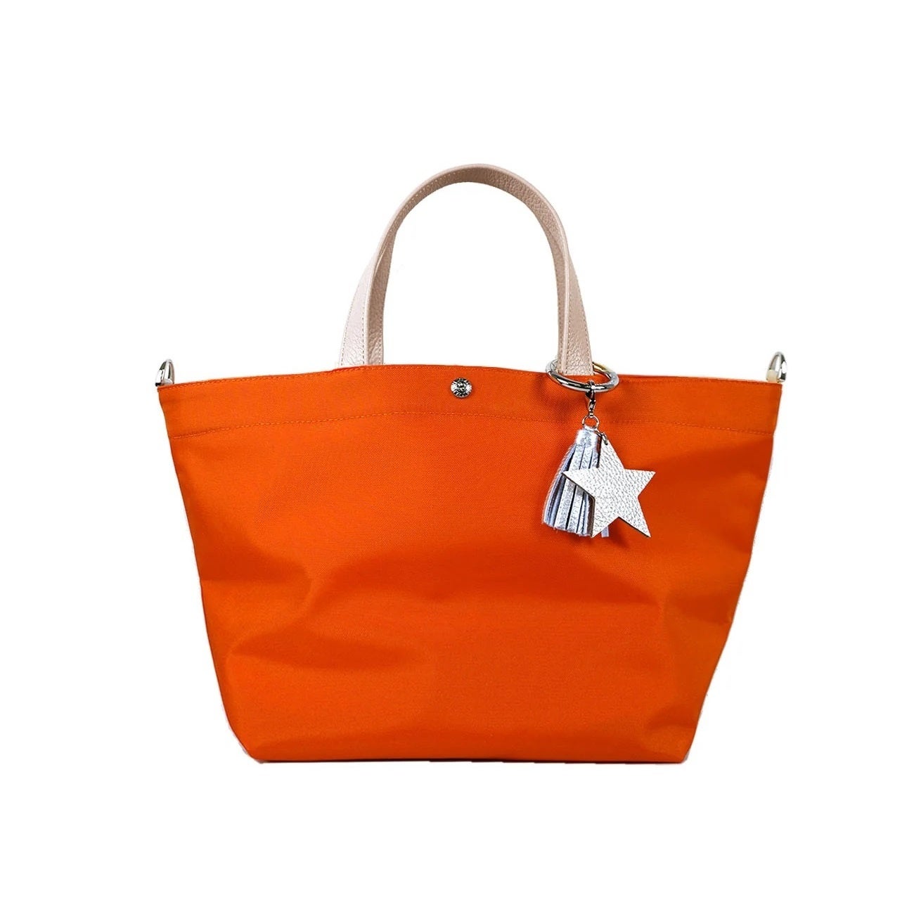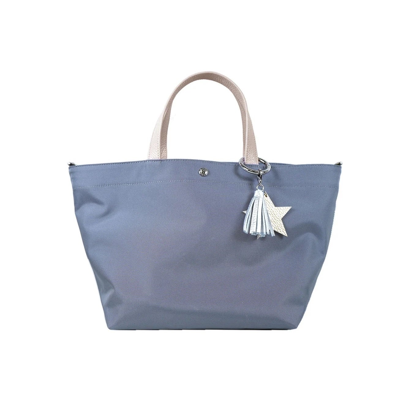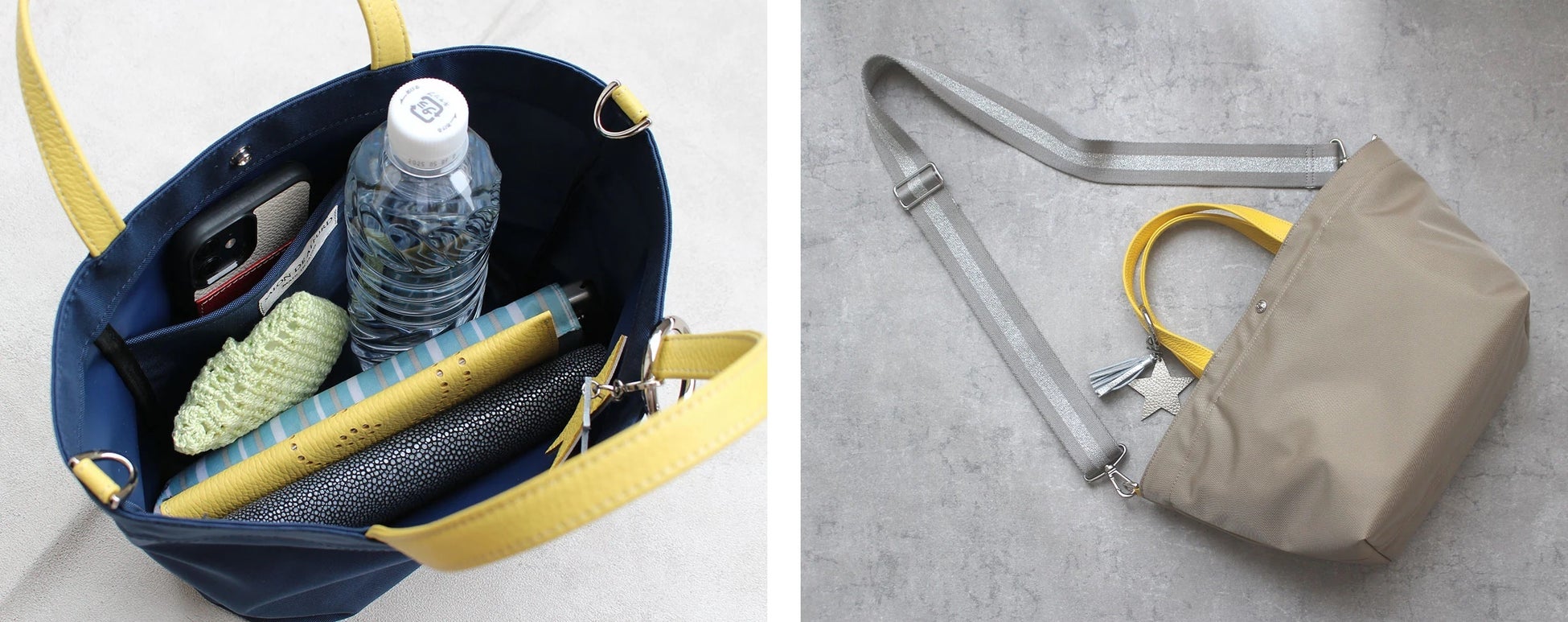 内側にPVC加工を施した防水性の高いナイロン素材を採用、重さは250g以下(※チャーム装着時)と超軽量。カジュアルになりがちなナイロントートバッグに、あえて上質なイタリアンレザーを合わせ、品格をプラス。ナイロン生地とレザーハンドルをバイカラーでデザインし、大人のおしゃれ感を演出します。