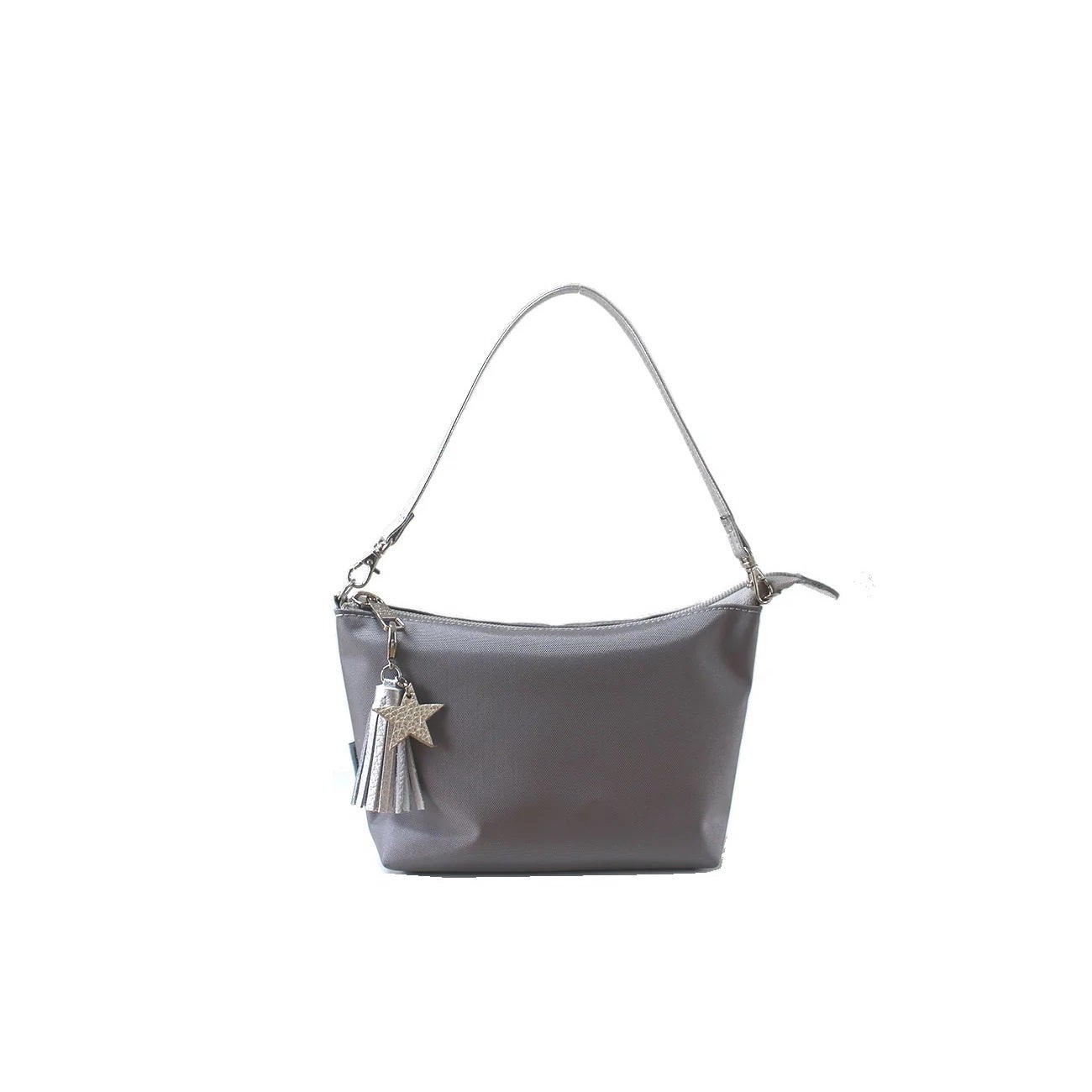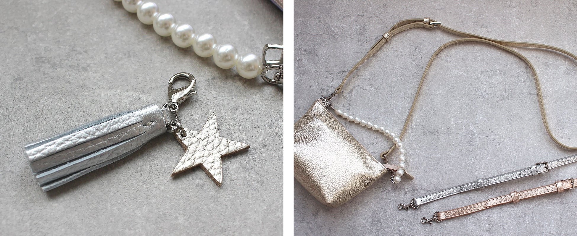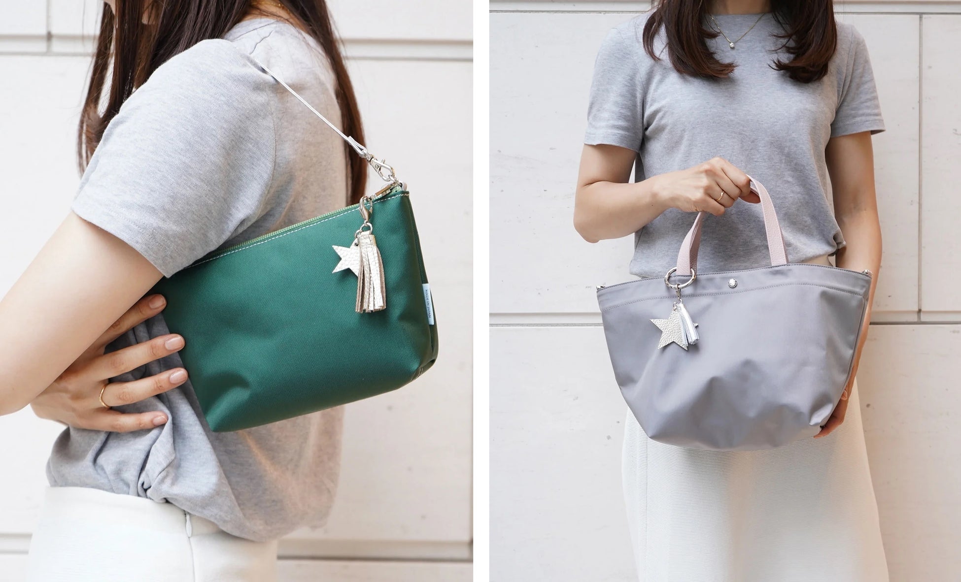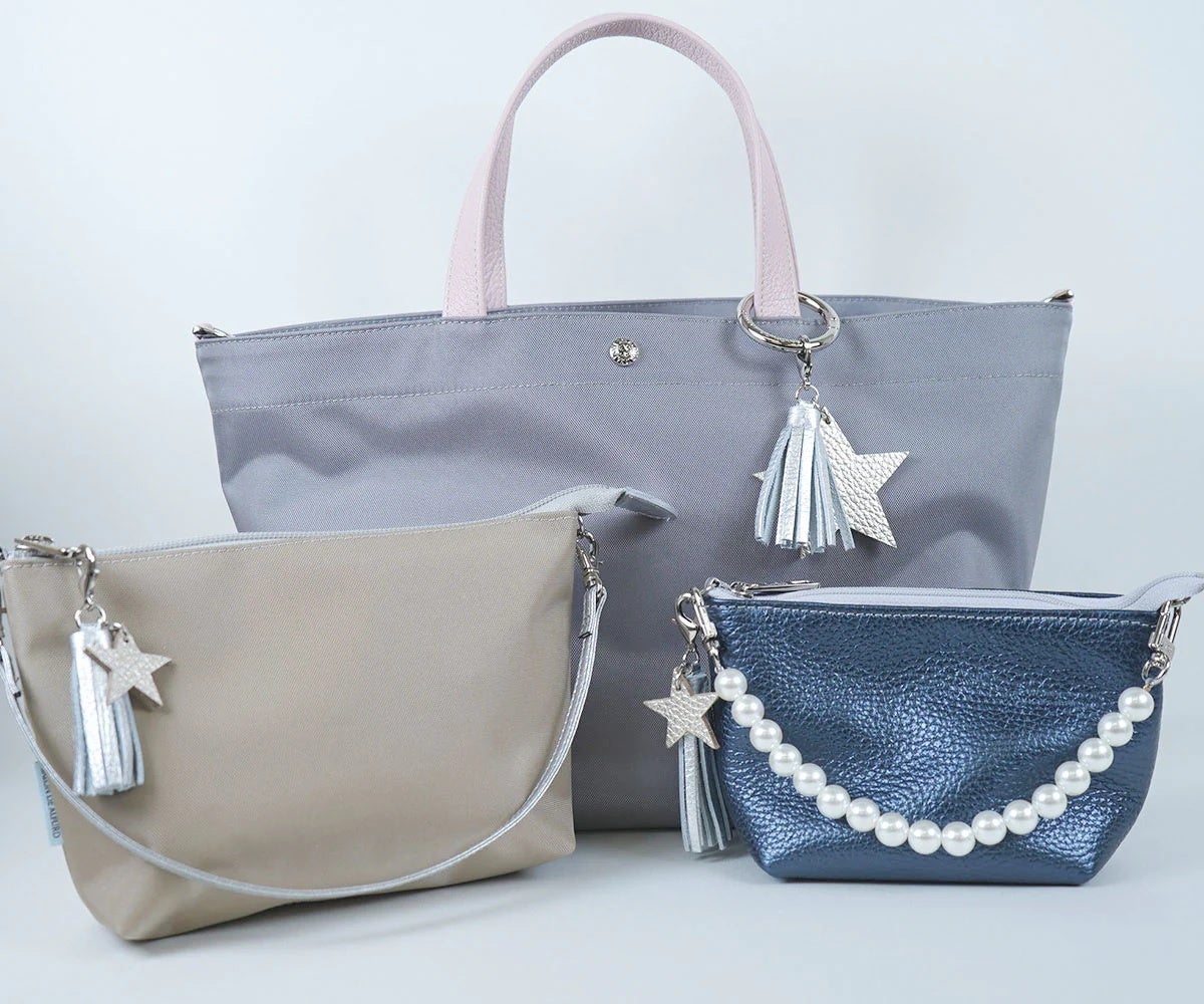 天の川を流れる星をイメージした、取り外し可能なレザーチャームをセットしたバッグ3型がラインナップ。イタリアンレザー製の煌めくシルバーメタリックカラーがデザインのポイントになっています。