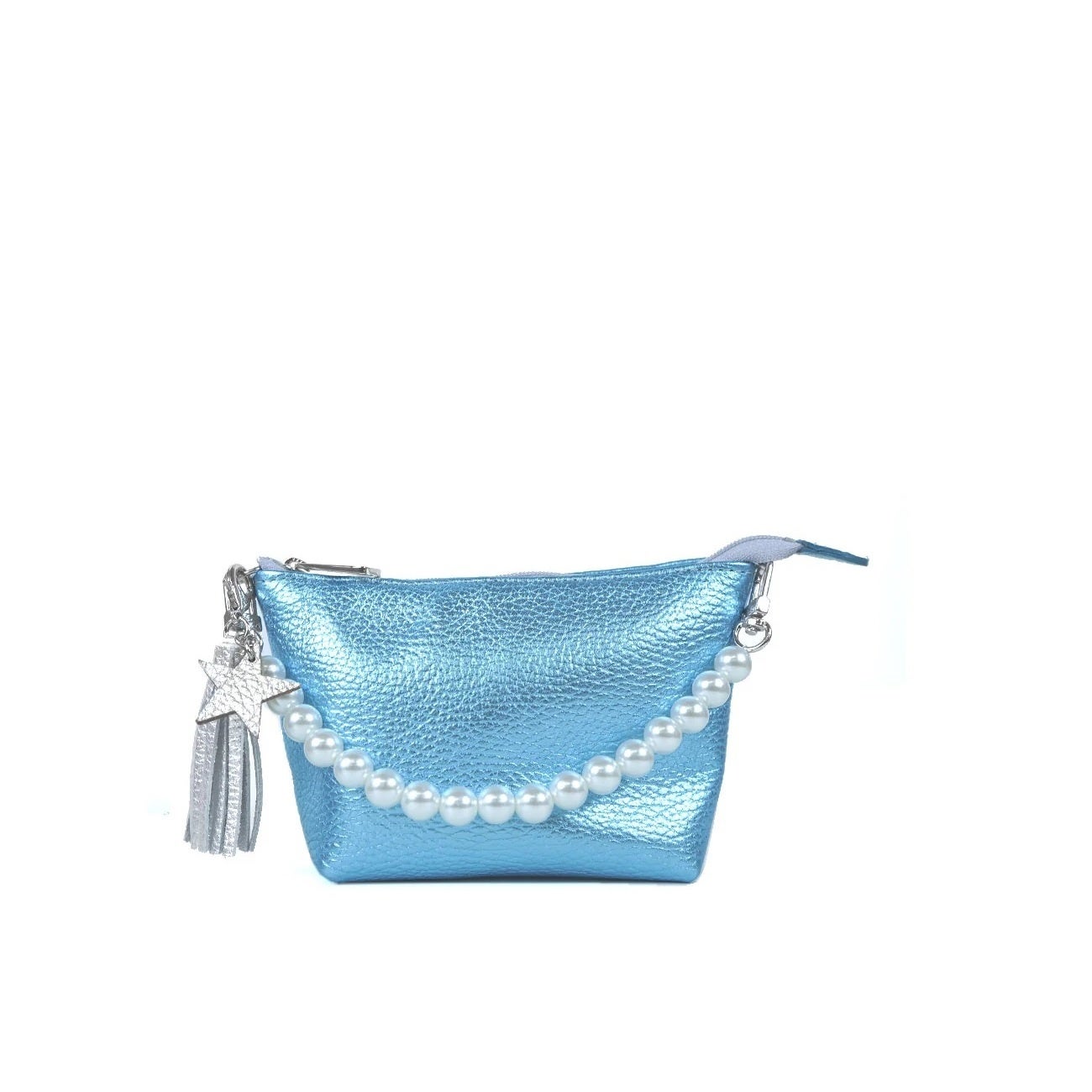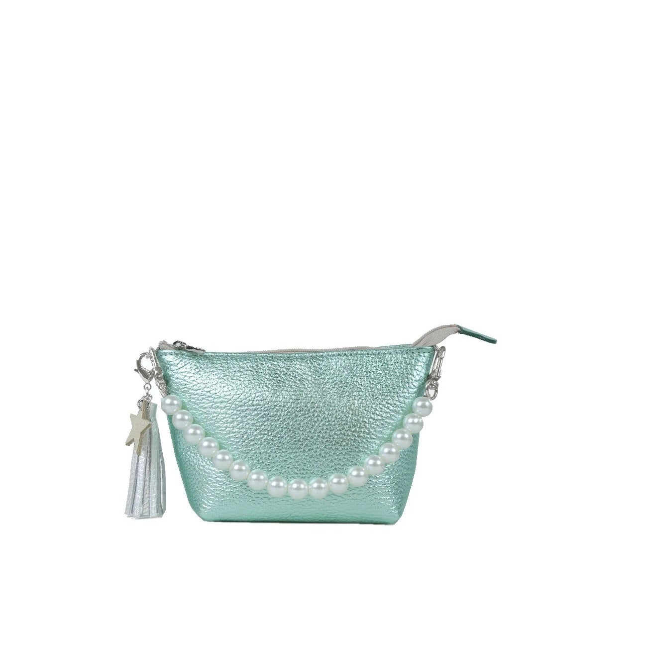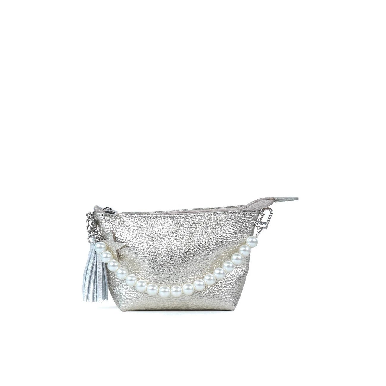 可愛らしいデザインのレザーポーチは、取り外し可能なパールのショートハンドルが付いているので、ミニバッグに変身させて、普段使いからパーティーシーンまで幅広く活躍します。