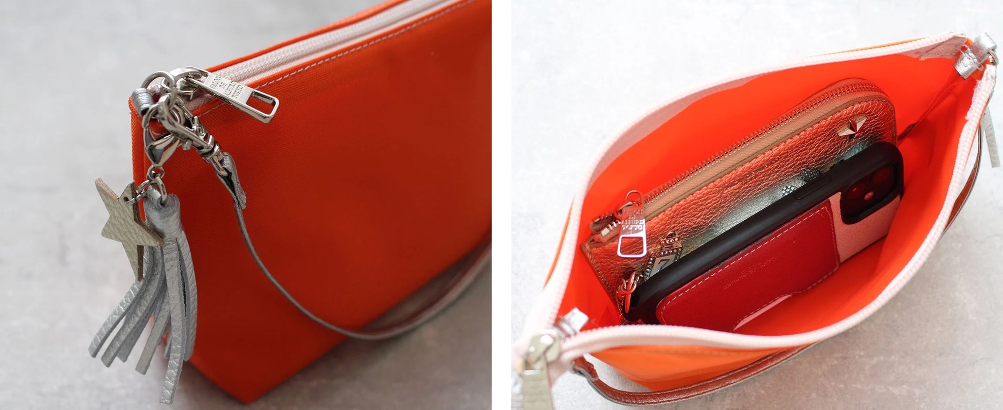 タッセルチャームとショートハンドルはバッグ本体から着脱可能。取り外してキーホルダーとして活用したり、シンプルなポーチとしてもお使いいただけます。