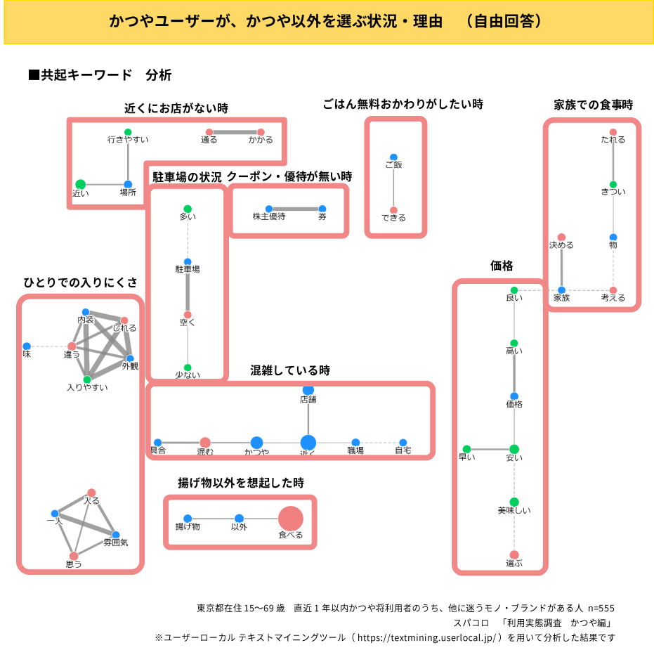1年以内にかつやを利用した人に聞いた、かつやを利用する状況についてみていきます。以下は、かつや以外を利用する状況についての自由回答をユーザーローカル テキストマイニングツールを用いて関連度が高いキーワードの傾向(共起キーワード)を分析・可視化した図です。