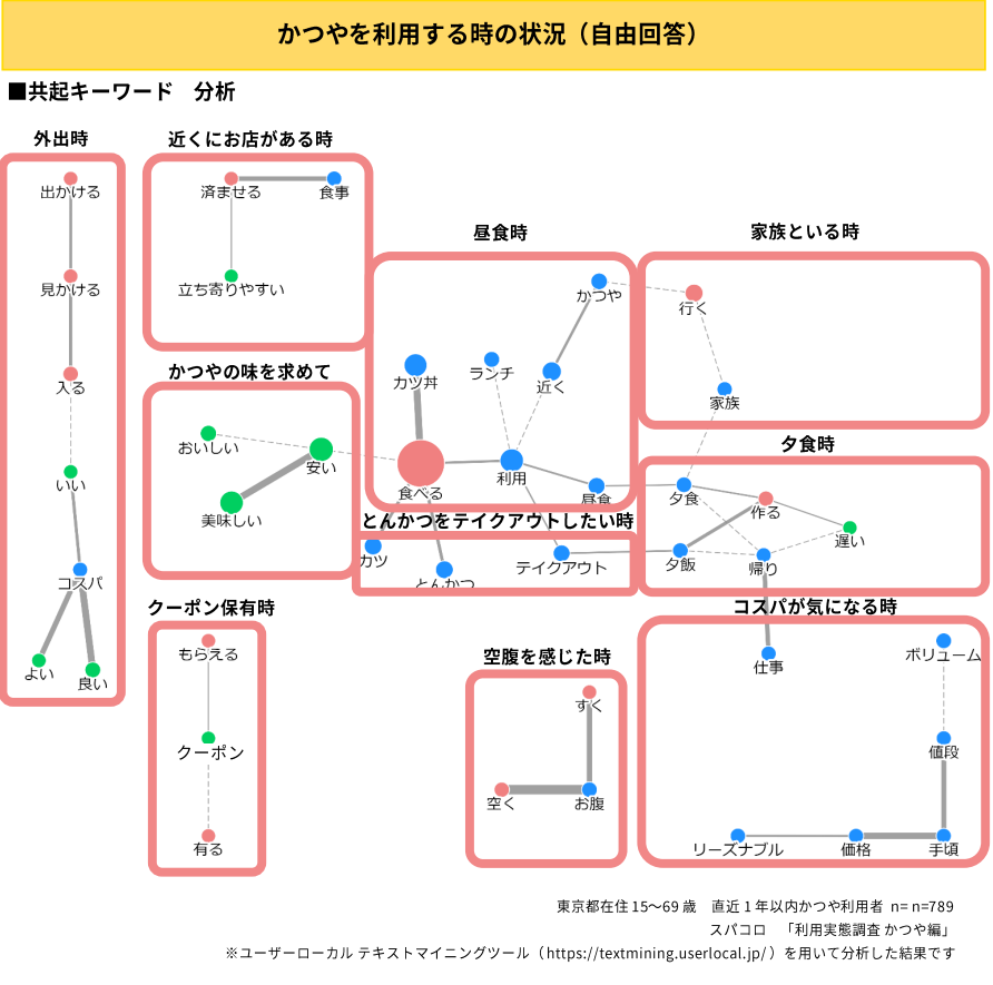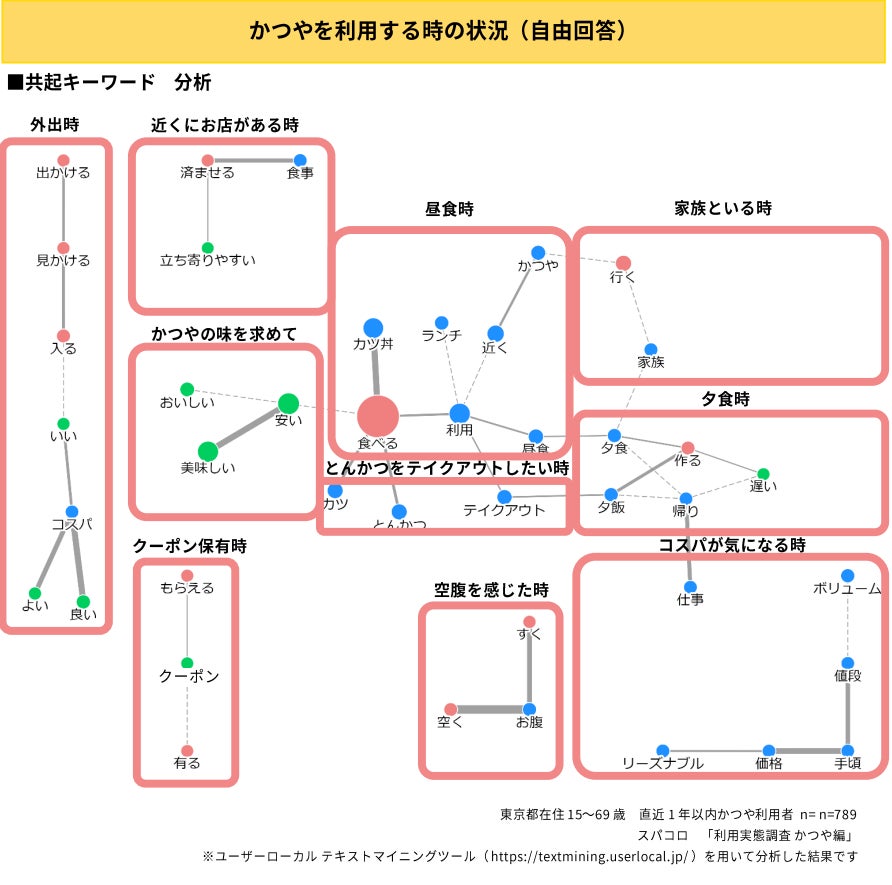 図から、かつやを利用する状況には「外出時」「近くにお店がある時」「昼食時」「家族といる時」「夕食時」「とんかつをテイクアウトしたい時」「かつやの味を求めて」「クーポン保有時」「空腹を感じた時」「コスパが気になる時」が挙がっています。