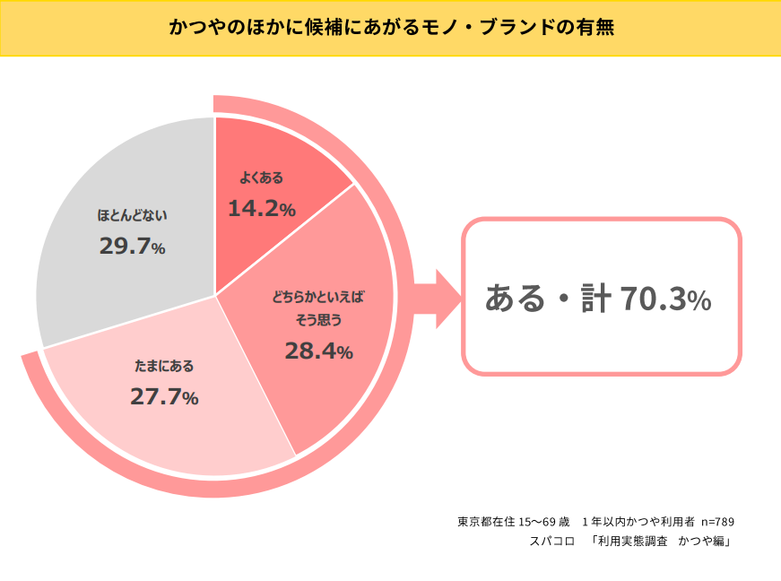 『かつやに代わって選んだり、かつやとどちらを利用するか迷うモノやブランドはありますか?』という質問に対して、「ある」と回答した人の合計は、かつやの 1 年以内利用顧客のうち 70.3%。これに対し「ほとんどない」と回答した人の割合は 29.7%。1 年以内利用顧客のおよそ3人に1人は他のブランドと比較することなくかつやを選ぶことがわかります。
