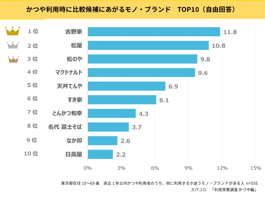 かつやを直近1年以内に利用した人に聞いた比較対象とされているモノ・ブランドでは、上位から「吉野家」11.8%、「松屋」10.8%、「松のや」9.8%が続いています。それ以下にも丼ぶりチェーンが多くランクインしており、主な比較対象となっていることがわかります。