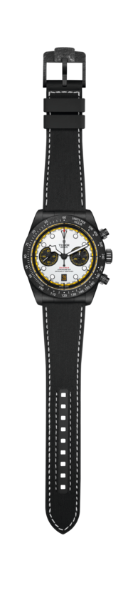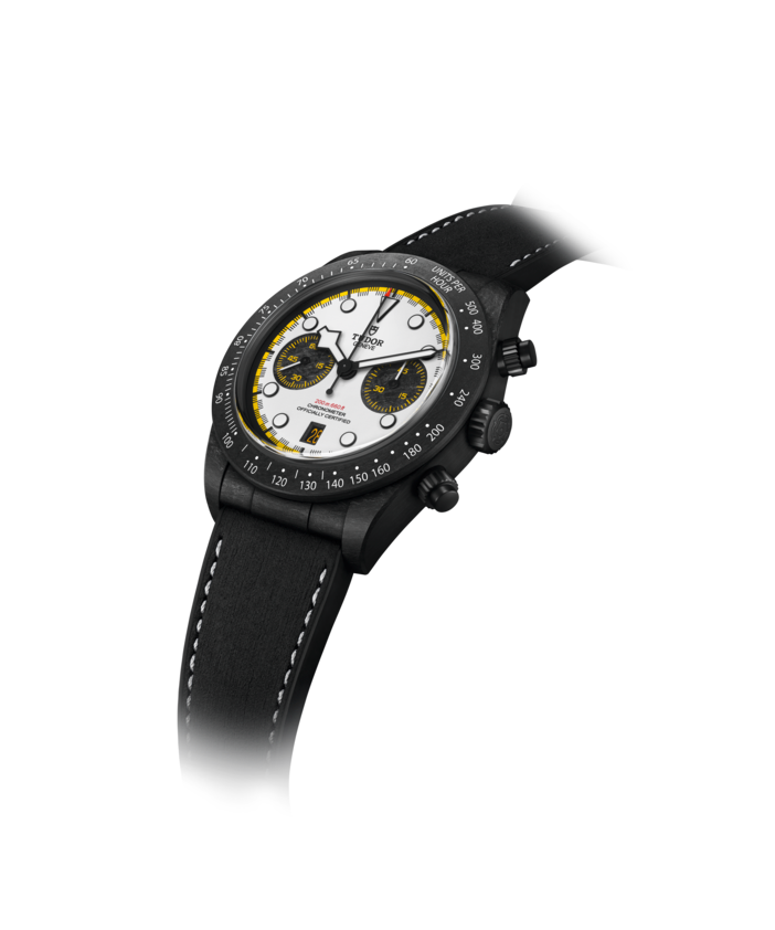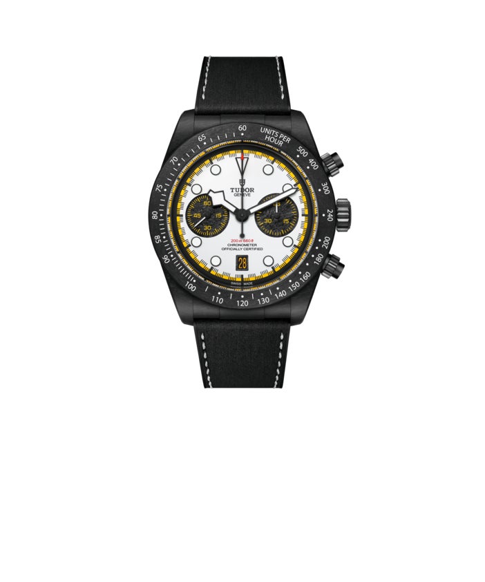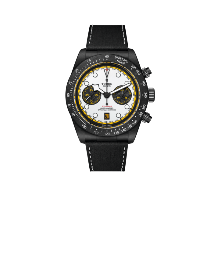 ブラックベイの美学に忠実なブラックベイ クロノは、1969年代以来チューダーのダイバーズウォッチのアイコンとなっている有名な「スノーフレーク」針を採用し、2つのブラックサブカウンターが配され、最適な視認性を確保するドーム型「レーシングホワイト」ダイアルを備える。初期のチューダー クロノグラフに着想を得て、45分カウンターと6時位置にカレンダーを備えるダイアル。42 mmのカーボンファイバー製ケースを舞台に、ブラックベイラインの特徴である、面取りされたラグとチューダーローズが刻印されたリューズが存在感を示す。 チューダーならではの細部への徹底した追求を体現するチタニウム製プッシャーのデザインは、初期のチューダー クロノグラフから着想を得ている。タキメーター目盛りを備えたカーボンファイバー製の固定ベゼルが、このスポーティクロノグラフの外観と機能を完成させている。