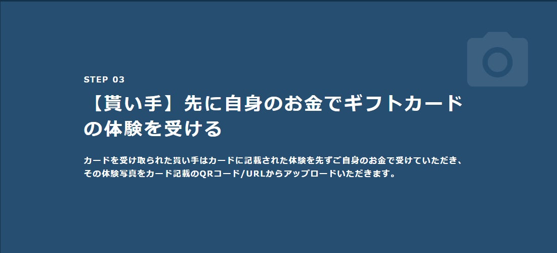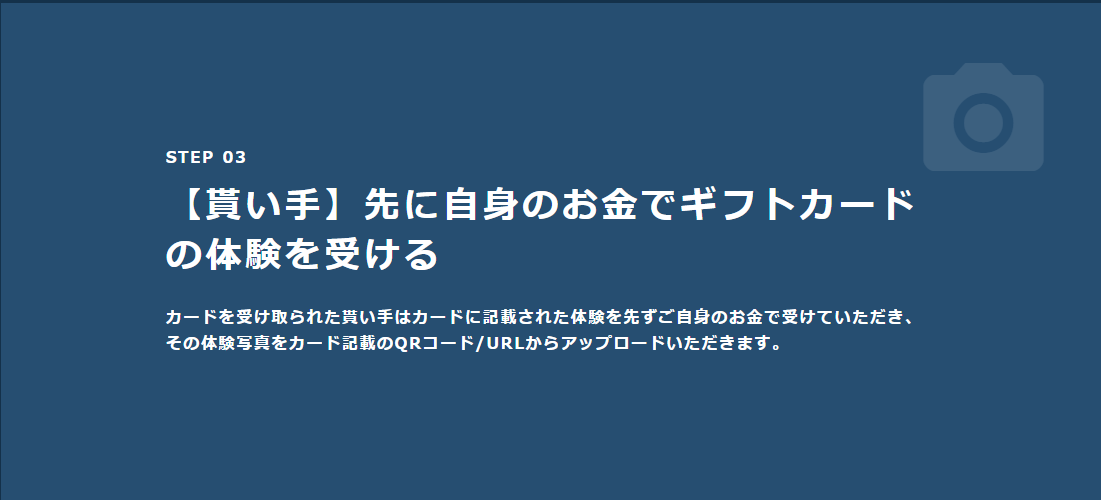体験写真をギフトカード上のQRコード/URLからアップロードすることにより、事前に贈り手が支払ったギフトカード金額が貰い手に入金されます。