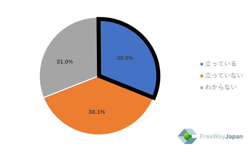 代表取締役の方に今年度の冬のボーナスに対して支給の見込みが立っているか聞いたところ、「立っていない」が38.1%、「わからない」が31.0%、「立っている」が30.9%という結果で、「立っている」回答は昨年度と比べて7.4ポイント上昇した。