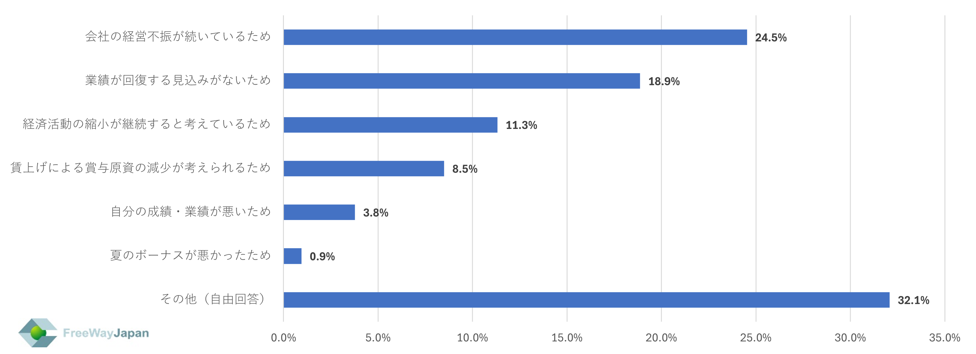上記で「期待できない」、「あまり期待できない」と回答した方に、期待できない理由を聞いたところ、「会社の経営不振が続いているため」が24.5%、「業績が回復する見込みがないため」が18.9%、「経済活動の縮小が継続すると考えているため」が11.3%、「賃上げによる賞与原資の減少が考えられるため」が8.5%、「自分の成績・業績が悪いため」が3.8%、「夏のボーナスが悪かったため」が0.9%、その他が32.1%という結果だった。