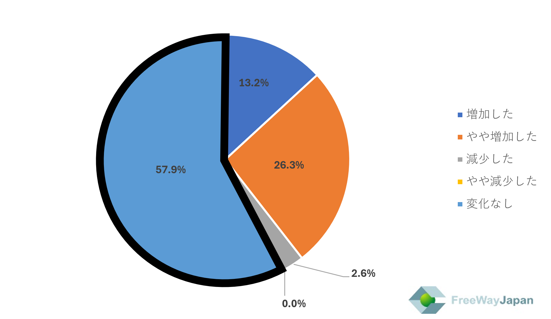 また、ボーナスが支給された、または支給予定で金額を把握している従業員の方に昨年の夏ボーナスと比べて増減はあったか聞いたところ、「変化なし」が最多で57.9%、「やや増加した」が26.3%、「増加した」が13.2%、「減少した」が2.6%、「やや減少した」が0.0%という結果だった。
