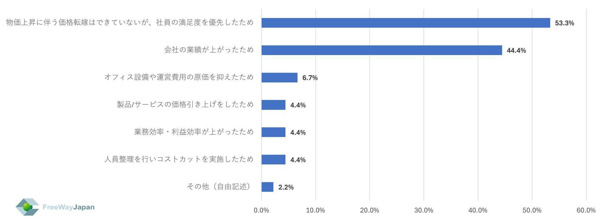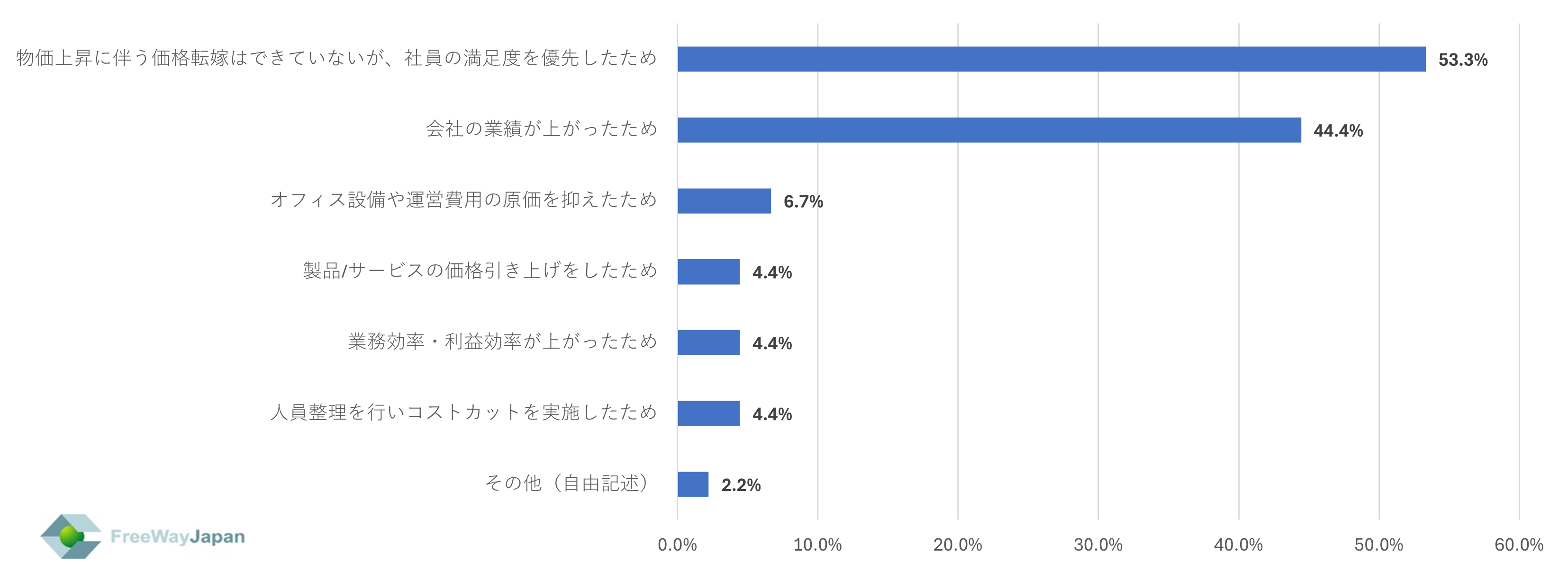 実施の理由は「価格転嫁はできていないが、社員の満足度を優先」が53.3%で最多の結果に