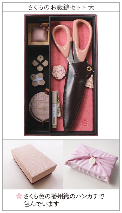 さくら色の漆の裁ちばさみと限定商品が入った、たくさん収納できるお裁縫セットです。